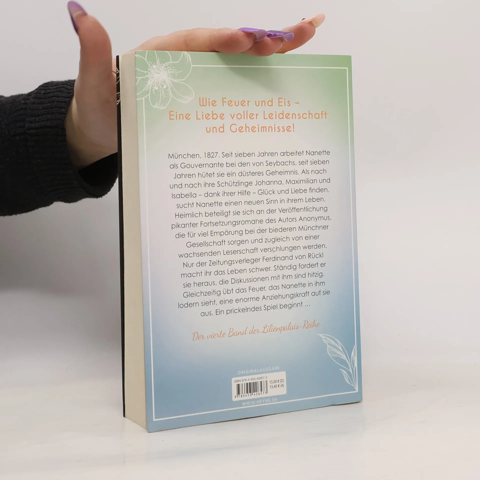Wie Feuer und Eis – Eine Liebe voller Leidenschaft und Geheimnisse München, 1827. Seit sieben Jahren arbeitet Nanette als Gouvernante bei den von Seybachs, seit sieben Jahren hütet sie ein düsteres Geheimnis. Als nach und nach ihre Schützlinge Johanna, Maximilian und Isabella – dank ihrer Hilfe – Glück und Liebe finden, sucht Nanette einen neuen Sinn in ihrem Leben. Heimlich beteiligt sie sich an der Veröffentlichung pikanter Fortsetzungsromane des Autors Anonymus, die für viel Empörung bei der biederen Münchner Gesellschaft sorgen und zugleich von einer wachsenden Leserschaft verschlungen werden. Nur der Zeitungsverleger Ferdinand von Rückl macht ihr das Leben schwer. Ständig fordert er sie heraus, die Diskussionen mit ihm sind hitzig. Gleichzeitig übt das Feuer, das Nanette in ihm lodern sieht, eine enorme Anziehungskraft auf sie aus. Ein prickelndes Spiel beginnt ...