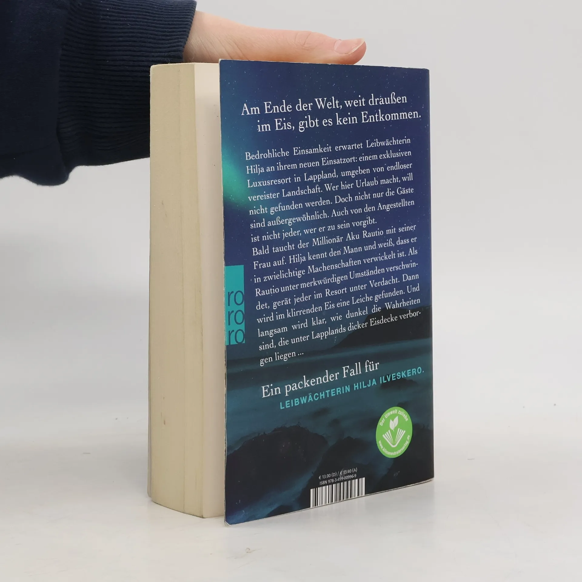 Ewige Weite, eisige Kälte. Ein Ort, an den nur Menschen mit viel Geld kommen – und solche mit düsteren Geheimnissen. Im klirrenden Eis eine Leiche. Und der Täter ist nah... Ein neuer Fall für die Leibwächterin. Bedrohliche Einsamkeit erwartet Leibwächterin Hilja an ihrem neuen Einsatzort: einem exklusiven Luxusresort in Lappland, umgeben von endloser vereister Landschaft. Wer hier Urlaub macht, will nicht gefunden werden. Doch nicht nur die Gäste sind außergewöhnlich. Auch von den Angestellten ist nicht jeder, wer er zu sein vorgibt. Bald taucht der Millionär Aku Rautio mit seiner Frau auf. Hilja kennt den Mann und weiß, dass er in zwielichtige Machenschaften verwickelt ist. Als Rautio unter merkwürdigen Umständen verschwindet, gerät jeder im Resort unter Verdacht. Und langsam wird klar, wie dunkel die Wahrheiten sind, die unter Lapplands dicker Eisdecke verborgen liegen … Der fünfte Fall für Leibwächterin Hilja, eine packende Locked-Room-Geschichte.
