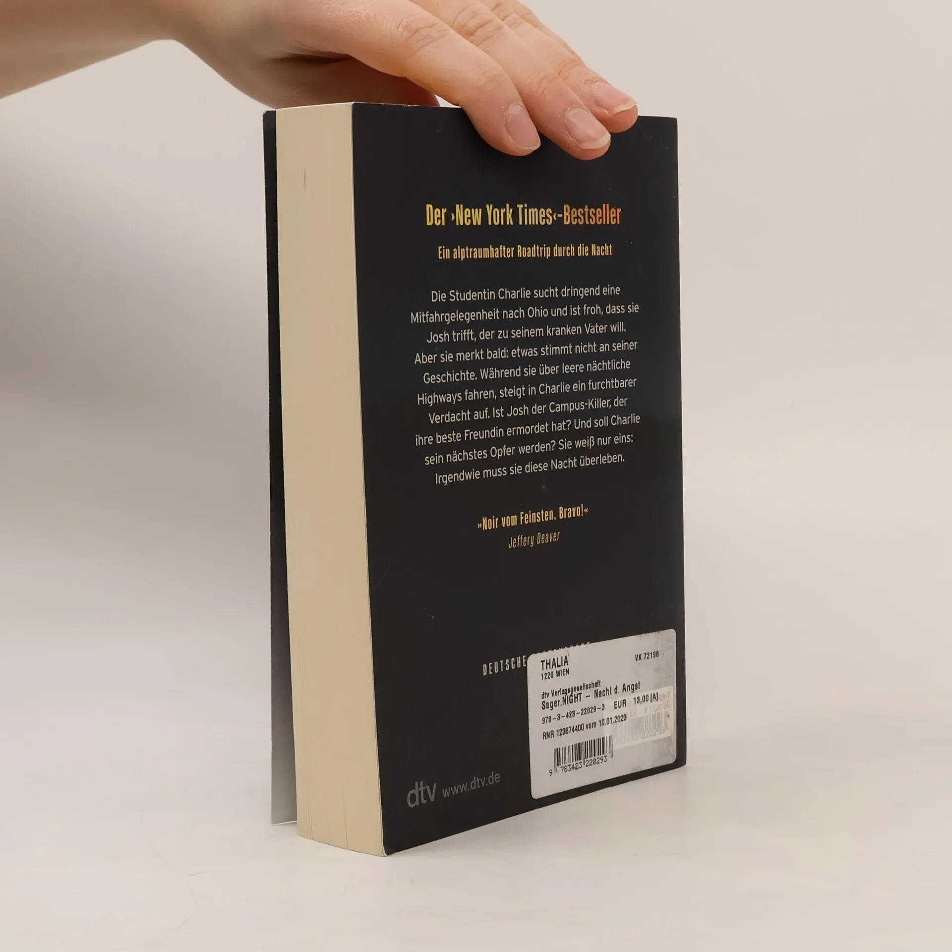 Irgendwie muss sie diese Nacht überleben Ein alptraumhafter Roadtrip durch die Nacht - Der neue ›New York Times‹–Bestseller von Riley Sager 1991. George W. Bush sitzt im Weißen Haus, im Kassettendeck läuft Nirvana, und die filmbegeisterte Studentin Charlie fährt mit einem Mann durch die Nacht, der vielleicht ein Serienkiller ist. Es war nur eine Mitfahrgelegenheit. Josh behauptet, er wolle zu seinem kranken Vater in Ohio. Aber etwas stimmt nicht an seiner Geschichte. Während sie über leere, dunkle Highways fahren, steigt in Charlie ein furchtbarer Verdacht auf. Ist es möglich, dass Josh der Campus-Killer ist, der ihre beste Freundin ermordet hat? Sie kann nicht weg, Hilfe holen ist unmöglich. Sie ist gefangen. Ein Thriller der Extraklasse, gruselig-atmosphärisch, voller Twists und mit einem überraschenden und schockierenden Ende. »Noir vom Feinsten. Bravo!« Jeffery Deaver »Wenn Sie einen schaurigen, unheimlichen Lass-bloß-das-Licht-an-Thriller suchen, gibt es nichts Besseres für Sie als Riley Sager.« CNN Von Riley Sager sind bei dtv außerdem folgende spannende Thriller erschienen: »Final Girls« »Schwarzer See« »Verschließ jede Tür« »HOME – Haus der bösen Schatten«
