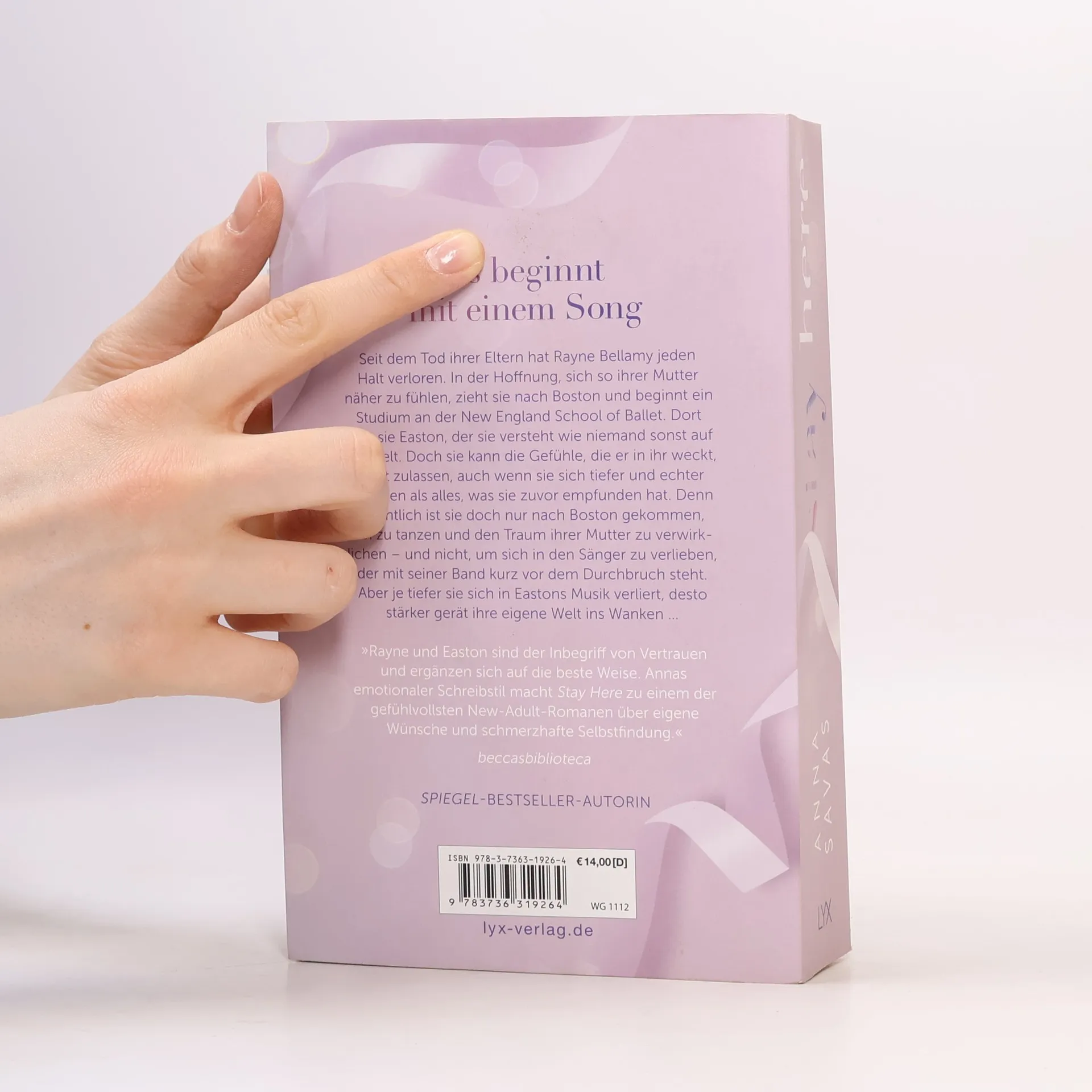 Es beginnt mit einem Song Seit dem Tod ihrer Eltern hat Rayne Bellamy jeden Halt verloren. In der Hoffnung, sich so ihrer Mutter näher zu fühlen, zieht sie nach Boston und beginnt ein Studium an der New England School of Ballet. Dort trifft sie Easton, der sie versteht wie niemand sonst auf der Welt. Doch sie kann die Gefühle, die er in ihr weckt, nicht zulassen, auch wenn sie sich tiefer und echter anfühlen als alles, was sie zuvor empfunden hat. Denn eigentlich ist sie doch nur nach Boston gekommen, um zu tanzen und den Traum ihrer Mutter zu verwirklichen ̶ und nicht, um sich in den Sänger zu verlieben, der mit seiner Band kurz vor dem Durchbruch steht. Aber je tiefer sie sich in Eastons Musik verliert, desto stärker gerät ihre eigene Welt ins Wanken ... »Rayne und Easton sind der Inbegriff von Vertrauen und ergänzen sich auf die beste Weise. Annas emotionaler Schreibstil macht STAY HERE zu einem der gefühlvollsten New-Adult-Romane über eigene Wünsche und schmerzhafte Selbstfindung.« BECCASBIBLIOTECA Band 2 der New-Adult-Reihe an der NEW ENGLAND SCHOOL OF BALLET von Anna Savas