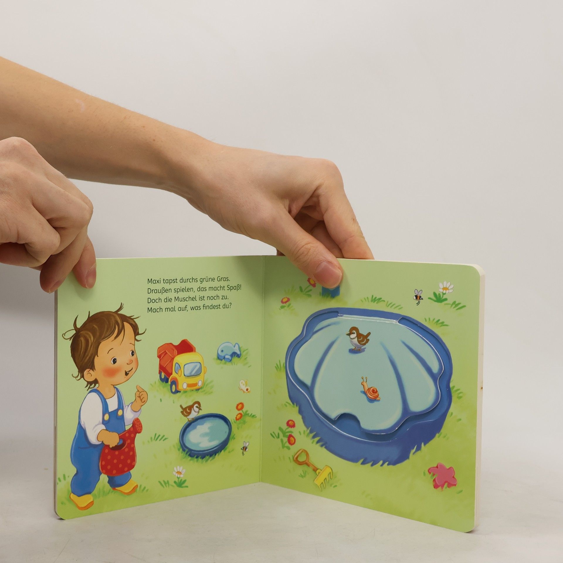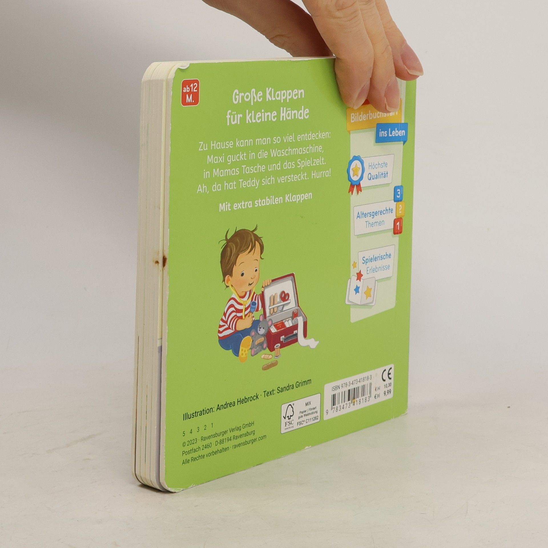 Spielbuch mit extra-dicken Klappen ab 12 Monaten Maxi liebt es Türen zu öffnen und überall reinzusehen. Es macht großen Spaß alles zu erkunden: Waschmaschine, Kühlschrank, Spielzelt … Was ist in der Waschmaschine? Hurra, hier ist Teddy! Und in der Wickeltasche? Da findet Maxi Schnuller und Schnuffelhase. Was versteckt sich wohl in der Sandmuschel im Garten? Ein liebevolles Buch für kleine Entdecker mit spannenden Kuckuck-Effekten. Die fröhlichen Bilder und extra-dicken Klappen sind ideal geeignet für Kinder ab 12 Monaten. Auf jeder Seite gibt es einen kurzen Reim, der eine kleine Geschichte erzählt und zum Öffnen der Klappe auffordert. Die Klappen lassen sich kinderleicht öffnen und bestehen aus besonders dickem Material. So sind sie extra-stabil und perfekt für kleine Hände. Die Klappen fallen ganz allein wieder zu und das Kuckuck-Spiel beginnt immer wieder von vorne! Großer Spielspaß für die Kleinen, der ganz nebenbei die Feinmotorik trainiert.