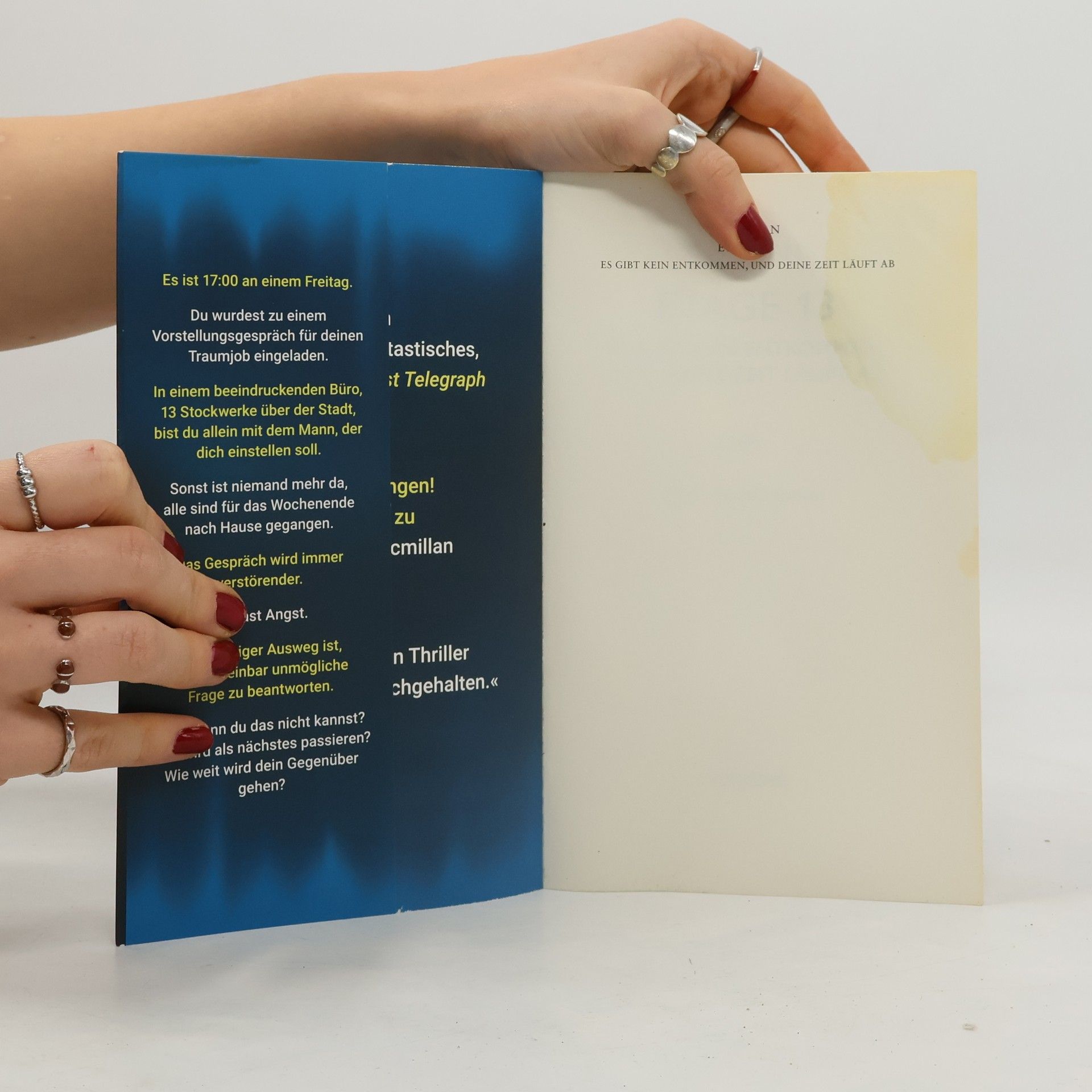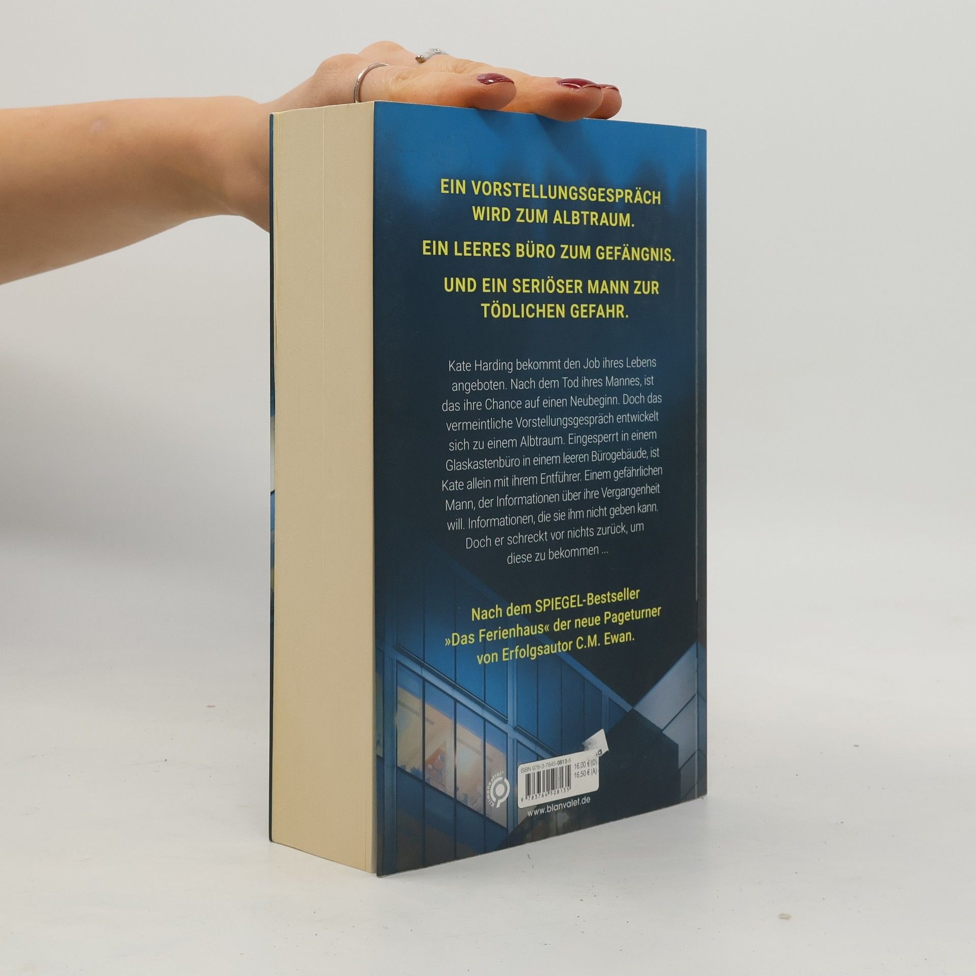 Ein Vorstellungsgespräch wird zum Albtraum. Ein leeres Büro zum Gefängnis. Und ein seriöser Mann zur tödlichen Gefahr. Nach dem SPIEGEL-Bestseller »Das Ferienhaus« der neue Pageturner von C. M. Ewan. Kate Harding bekommt den Job ihres Lebens angeboten. Nach dem Tod ihres Mannes vor fünfzehn Monaten, ist das ihre Chance auf einen Neubeginn. Doch das vermeintliche Vorstellungsgespräch entwickelt sich zu einem Albtraum. Eingesperrt in einem Glaskastenbüro in einem leeren Bürogebäude, ist Kate allein mit ihrem Entführer. Einem gefährlichen Mann, der Informationen über ihre Vergangenheit will. Informationen, die sie ihm nicht geben kann. Doch er schreckt vor nichts zurück, um diese zu bekommen ... Lesen Sie auch den SPIEGEL-Bestseller »Das Ferienhaus«.