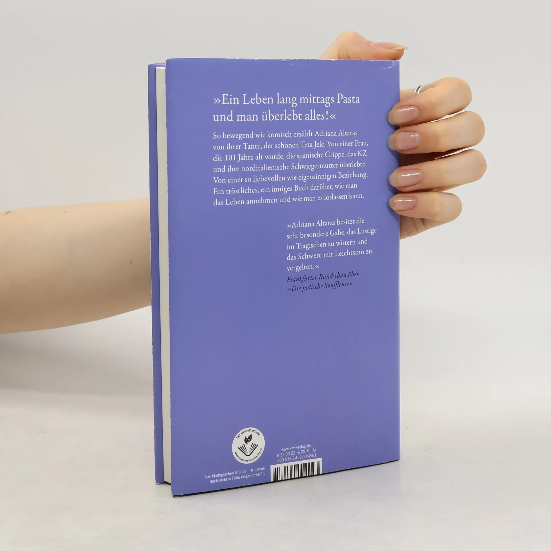 Adriana Altaras erzählt von ihrer Tante, der schönen Teta Jele, die 101 Jahre alt wurde und die spanische Grippe, das KZ sowie ihre norditalienische Schwiegermutter überlebte. Ihre Beziehung ist liebevoll und eigensinnig, und sie zeigt, wie man das Leben annimmt. Als Adriana mit vier Jahren aus Zagreb fliehen muss, kommt sie zu ihrer Tante nach Italien, wo sie ihr Leben lang immer wieder zurückkehrt. In den Sommerferien, mit ihrer Abiklasse und all ihren Liebhabern, die sich dem aristokratischen Blick der Tante stellen müssen. Als Adrianas Mann sie nach dreißig Jahren verlässt, steht die 98-jährige Tante ihr am Gardasee mit Pasta, pragmatischen Ratschlägen und Barbesuchen zur Seite. Den hundertsten Geburtstag von Teta Jele können sie nicht gemeinsam feiern, da sie im Pflegeheim ist und wegen der Pandemie keinen Besuch empfangen darf. Stattdessen telefonieren sie häufig und lassen Jeles bewegtes Leben Revue passieren: ihre Kindheit in Zagreb, die Rettung durch Giorgio, den sie aus Dankbarkeit heiratete, und die Liebe zu Fritz Epstein, der rechtzeitig nach Australien floh. Adriana Altaras entwirft ein zartes, bewegendes und zugleich komisches Porträt dieser kapriziösen Frau und zeigt auf, wie man das Leben annehmen und loslassen kann. Ein tröstliches, inniges Buch über das Altwerden und die eigene Geschichte im Kontext des Weltgeschehens.