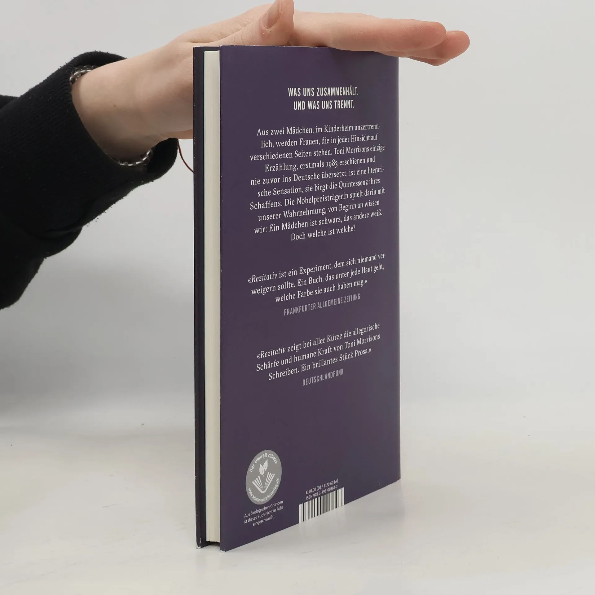 Die Wiederentdeckung von Toni Morrisons einziger Erzählung, erstmals 1983 erschienen und nie zuvor ins Deutsche übersetzt, ist eine literarische Sensation und enthält die Quintessenz ihres Schaffens. Die Nobelpreisträgerin spielt darin mit unserer Wahrnehmung: Von Beginn an wissen wir, dass eine der beiden Hauptfiguren schwarz ist und die andere weiß – doch welche ist welche? Twyla und Roberta begegnen sich als Achtjährige im Kinderheim. Sie werden Vertraute, geben einander Halt und Trost. Sie sind unzertrennlich, doch später verlieren sie sich aus den Augen. Zufällig begegnen sie einander immer wieder, erst in einem Diner, dann im Supermarkt und bei einer Demonstration. Sie stehen in jeder Hinsicht auf verschiedenen Seiten und sind sich uneinig über die wichtigsten Fragen – trotzdem fühlen sich die beiden Frauen einander tief verbunden. Rezitativ erzählt eindrucksvoll und mit frappierender Aktualität über eine Mädchenfreundschaft und die Auswirkungen von Rassismus und Klassenzugehörigkeit auf die Beziehungen, die unser Leben prägen.