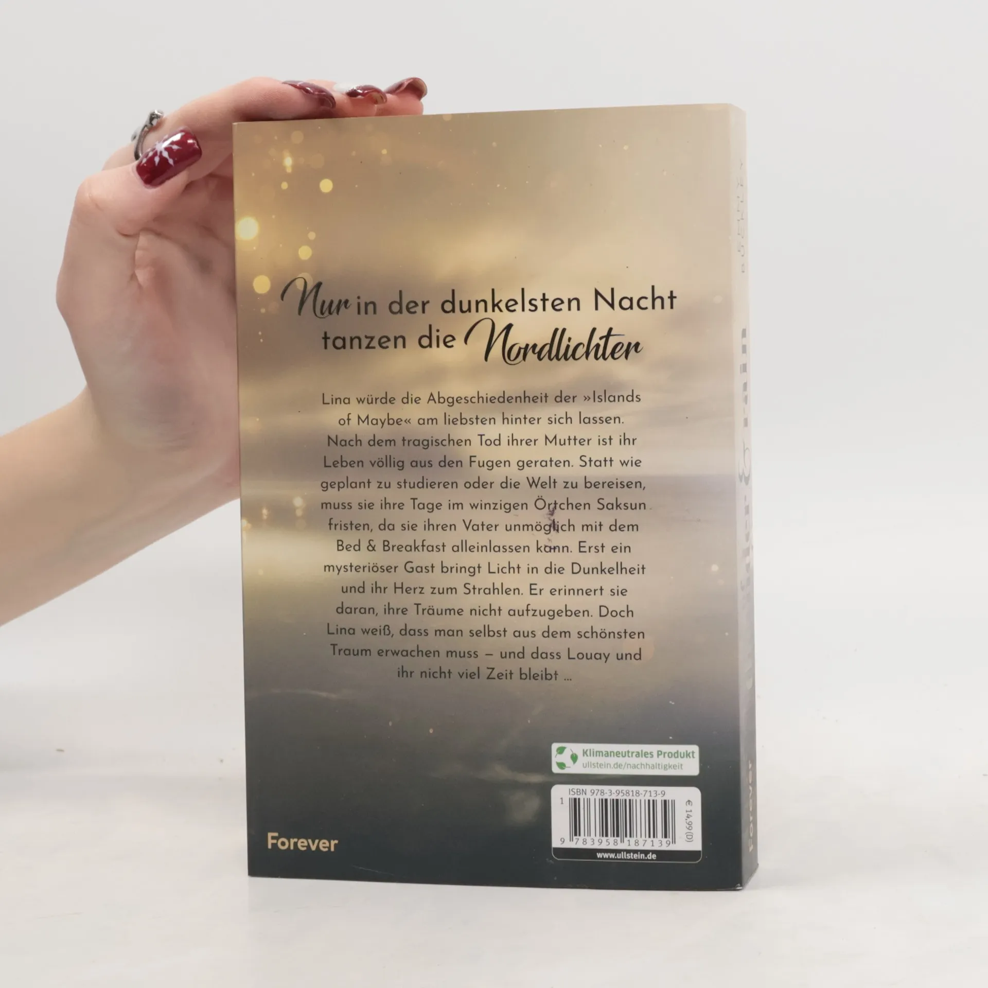 Nur in der dunkelsten Nacht tanzen die Nordlichter Der junge Schriftsteller Louay hat alles – seinen Traumjob, Erfolg und den Bestseller-Sticker auf sämtlichen seiner Werke. Doch die Sache hat einen Haken: Er versteckt sich hinter einem Pseudonym und weiß langsam nicht mehr, wer er eigentlich ist. Nach einem heftigen Streit mit seinen Eltern reist er auf die Färöer Inseln, um sich inspirieren zu lassen. Lina würde die Abgeschiedenheit der »Islands of Maybe« am liebsten hinter sich lassen. Nach dem tragischen Tod ihrer Mutter ist ihr Leben völlig aus den Fugen geraten. Statt wie geplant an die Universität zu gehen und die Welt zu bereisen, muss sie ihre Tage im winzigen Örtchen Saksun fristen, da sie ihren Vater unmöglich mit dem Bed & Breakfast zurücklassen kann. Der mysteriöse Gast ist der erste Lichtblick seit langem für sie. Doch die zarten Gefühle werden auf eine harte Probe gestellt, als Louay von der Realität eingeholt wird …