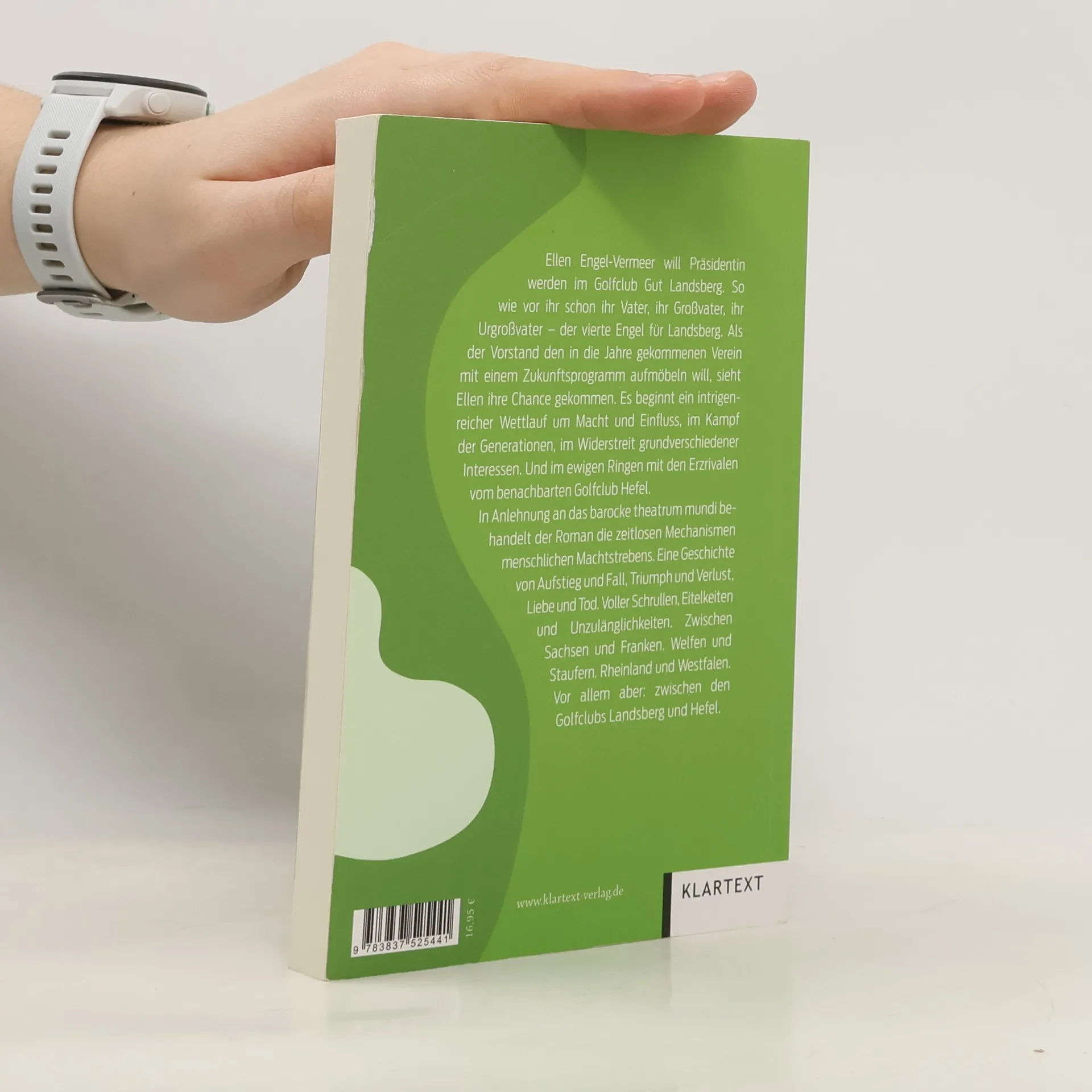 Ellen Engel-Vermeer will Präsidentin werden im Golf Club Gut Landsberg. So wie vor ihr schon ihr Vater, ihr Großvater, ihr Urgroßvater – der vierte Engel für Landsberg. Als der Vorstand den in die Jahre gekommenen Verein mit einem Zukunftsprogramm aufmöbeln will, sieht Ellen ihre Chance gekommen. Es beginnt ein intrigenreicher Wettlauf um Macht und Einfluss, im Kampf der Generationen, im Widerstreit grundverschiedener Interessen. Und im ewigen Ringen mit den Erzrivalen vom benachbarten Golfclub Hefel. In Anlehnung an das barocke theatrum mundi behandelt der Roman die zeitlosen Mechanismen menschlichen Machtstrebens. Eine Geschichte von Aufstieg und Fall, Triumph und Verlust, Liebe und Tod. Voller Schrullen, Eitelkeiten und Unzulänglichkeit. Zwischen Sachsen und Franken. Welfen und Staufern. Rheinland und Westfalen. Vor allem aber: zwischen den Golfclubs Landsberg und Hefel.