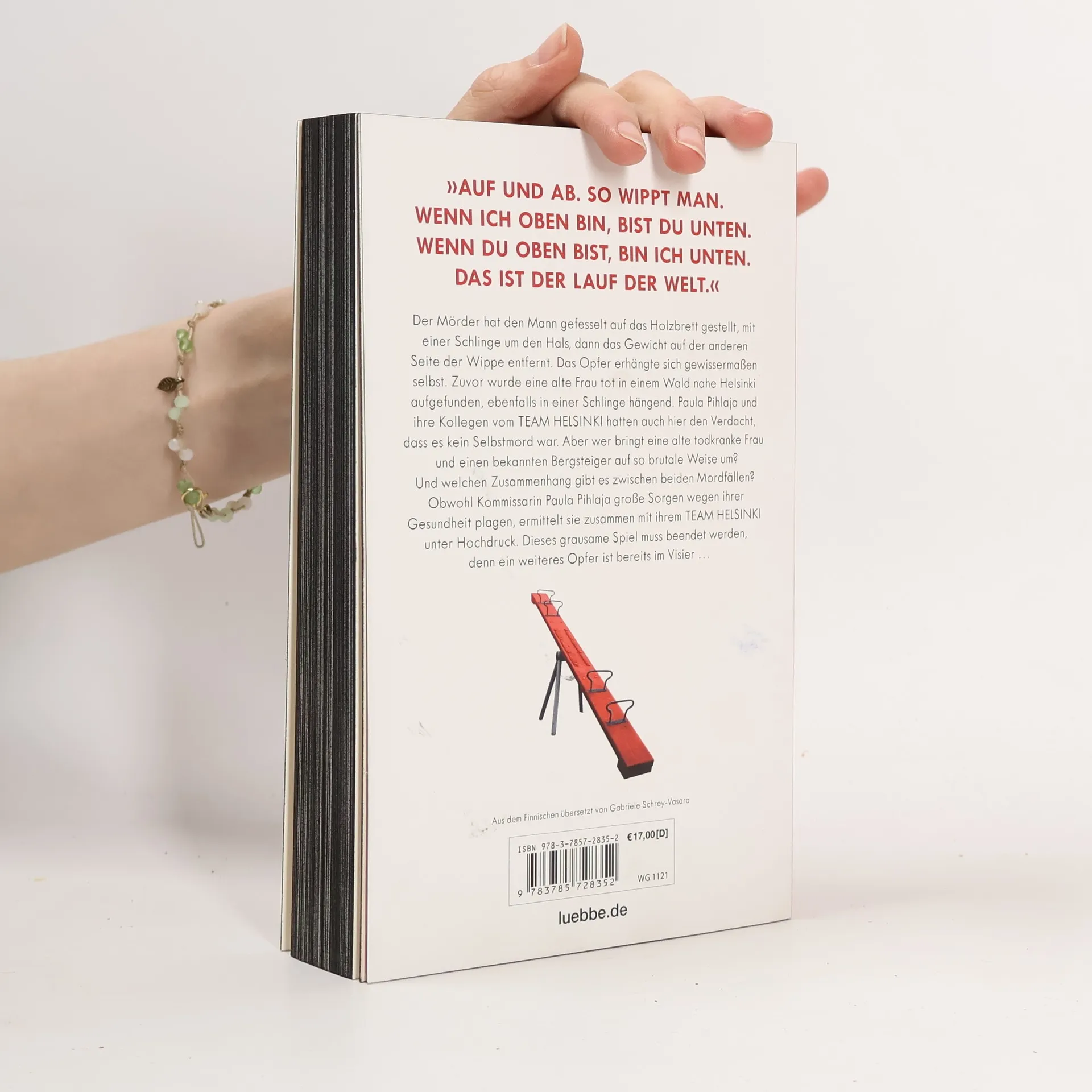 Die alte Frau hatte nicht mehr lange zu leben, die Krankheit war bereits weit fortgeschritten. Als sie tot in einem Wald nahe Helsinki aufgefunden wird, an einer Schlinge hängend, geht die Polizei von einem Selbstmord aus. Paula Pihjala jedoch ist skeptisch, irgendetwas passt da nicht ins Bild. Als kurz darauf ein Mann auf einem Spielplatz tot aufgefunden wird, steht fest, dass es ein Mord war. Der Mörder hatte das Opfer auf eine Wippe gestellt, mit einer Schlinge um den Hals, dann das Gewicht entfernt. Das Opfer erhängte sich selbst. Was für ein Sadismus! Ein weiteres Opfer ist offenbar schon im Visier. Paula Pihjala und ihr Team ermitteln unter Hochdruck, um dieses grausame Spiel zu beenden.