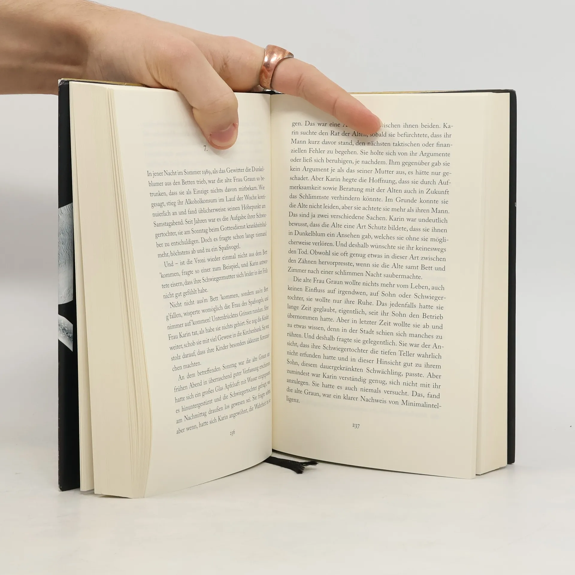 Jeder schweigt von etwas anderem. Dunkelblum scheint auf den ersten Blick eine gewöhnliche Kleinstadt zu sein, doch hinter der Fassade verbirgt sich die Geschichte eines schrecklichen Verbrechens, das die älteren Bewohner seit Jahrzehnten verbindet – und gleichzeitig zum Schweigen zwingt. Im Spätsommer 1989, während an der nahen Grenze zu Ungarn Hunderte DDR-Flüchtlinge warten, erscheint ein geheimnisvoller Besucher in der Stadt. Plötzlich kommt Bewegung in die Dinge: Auf einer Wiese am Stadtrand wird ein Skelett entdeckt, und eine junge Frau verschwindet. Die Spuren des alten Verbrechens tauchen wie Geister auf und konfrontieren die Dunkelblumer mit einer Vergangenheit, die sie für abgeschlossen hielten. In ihrem neuen Roman entwirft Eva Menasse ein umfassendes Geschichtspanorama, das die kleine Stadt immer wieder zum Schauplatz weltpolitischer Ereignisse macht. Die Geschichte thematisiert den Umgang der Bewohner mit historischer Schuld und ist ein schaurig-komisches Epos über die Wunden in der Landschaft und den Seelen der Menschen, die, im Gegensatz zur Erinnerung, nicht vergehen. „Die ganze Wahrheit wird, wie der Name schon sagt, von allen Beteiligten gemeinsam gewusst. Deshalb kriegt man sie nachher nie mehr richtig zusammen.“