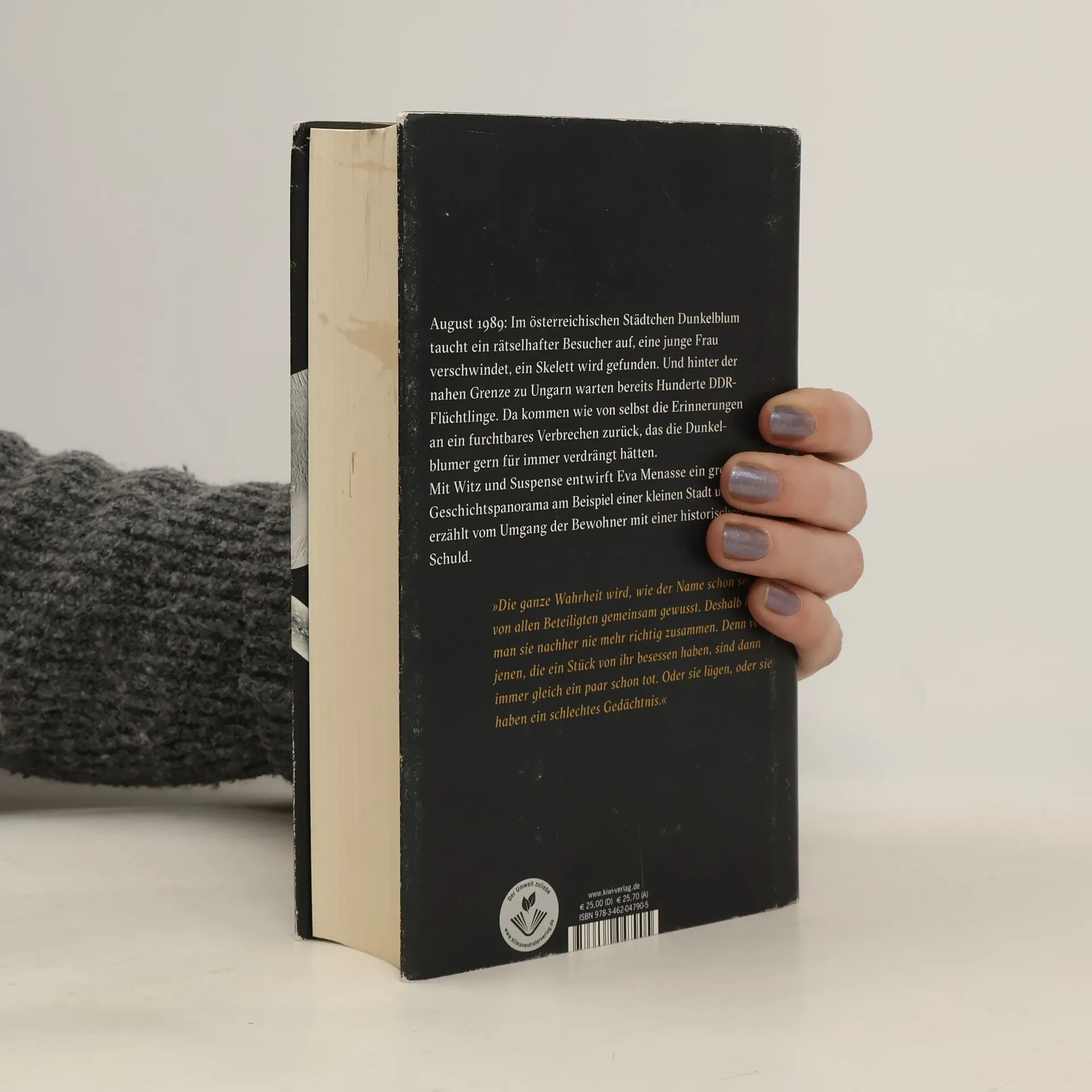 Jeder schweigt von etwas anderem. Dunkelblum scheint auf den ersten Blick eine gewöhnliche Kleinstadt zu sein, doch hinter der Fassade verbirgt sich die Geschichte eines schrecklichen Verbrechens, das die älteren Bewohner seit Jahrzehnten verbindet – und gleichzeitig zum Schweigen zwingt. Im Spätsommer 1989, während an der nahen Grenze zu Ungarn Hunderte DDR-Flüchtlinge warten, erscheint ein geheimnisvoller Besucher in der Stadt. Plötzlich kommt Bewegung in die Dinge: Auf einer Wiese am Stadtrand wird ein Skelett entdeckt, und eine junge Frau verschwindet. Die Spuren des alten Verbrechens tauchen wie Geister auf und konfrontieren die Dunkelblumer mit einer Vergangenheit, die sie für abgeschlossen hielten. In ihrem neuen Roman entwirft Eva Menasse ein umfassendes Geschichtspanorama, das die kleine Stadt immer wieder zum Schauplatz weltpolitischer Ereignisse macht. Die Geschichte thematisiert den Umgang der Bewohner mit historischer Schuld und ist ein schaurig-komisches Epos über die Wunden in der Landschaft und den Seelen der Menschen, die, im Gegensatz zur Erinnerung, nicht vergehen. „Die ganze Wahrheit wird, wie der Name schon sagt, von allen Beteiligten gemeinsam gewusst. Deshalb kriegt man sie nachher nie mehr richtig zusammen.“