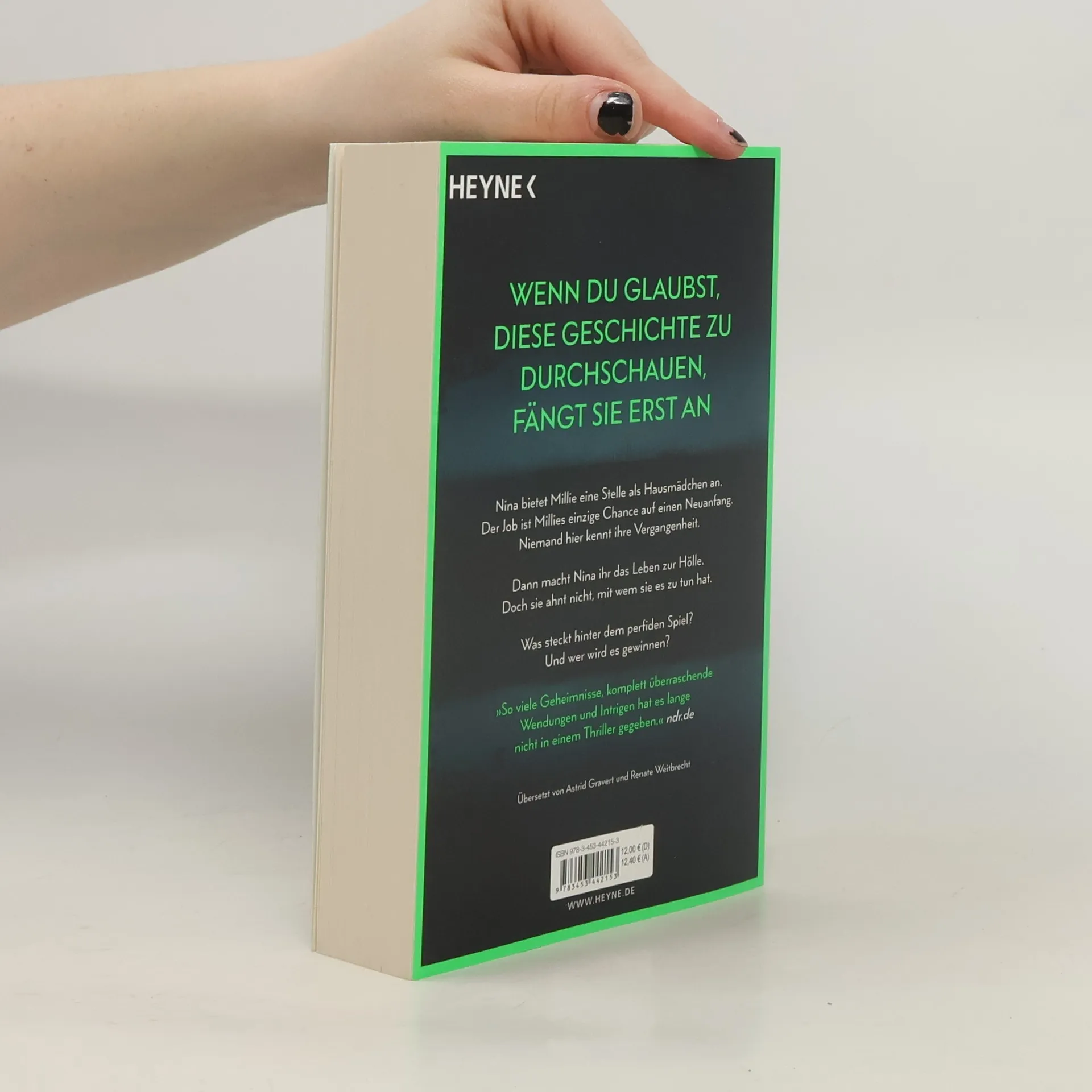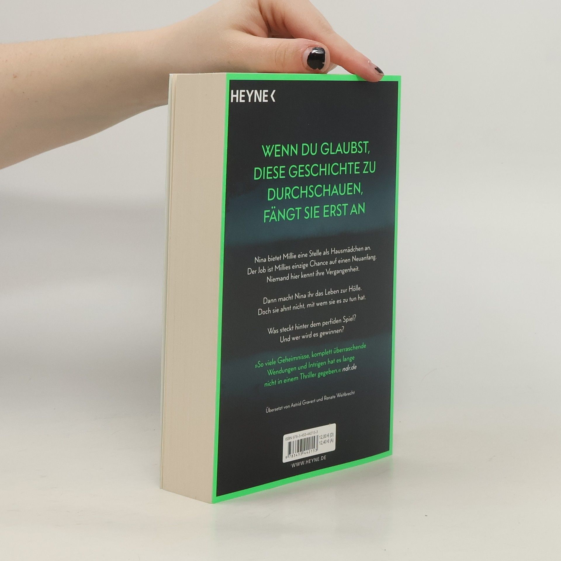 Wenn du glaubst, diese Geschichte zu durchschauen, fängt sie erst an Millie kann ihr Glück kaum fassen, als die elegante Nina ihr die Stelle als Haushaltshilfe inklusive Kost und Logis bei ihrer Familie auf Long Island anbietet. Schließlich hat sie eine Vergangenheit, von der niemand etwas wissen soll. Doch kaum ist Millie eingezogen, zeigt Nina ihr wahres Gesicht: Sie verwüstet das Haus und unterstellt ihr Dinge, die sie nicht getan hat. Ihre verwöhnte Tochter behandelt Millie ohne jeden Respekt. Nur Ninas attraktiver Mann Andrew ist nett zu ihr. Wäre da nur nicht Ninas wachsende Eifersucht. Hat sie Millie nur eingestellt, um ihr das Leben zur Hölle zu machen? Oder hat auch sie ein dunkles Geheimnis, von dem niemand etwas erfahren darf?
