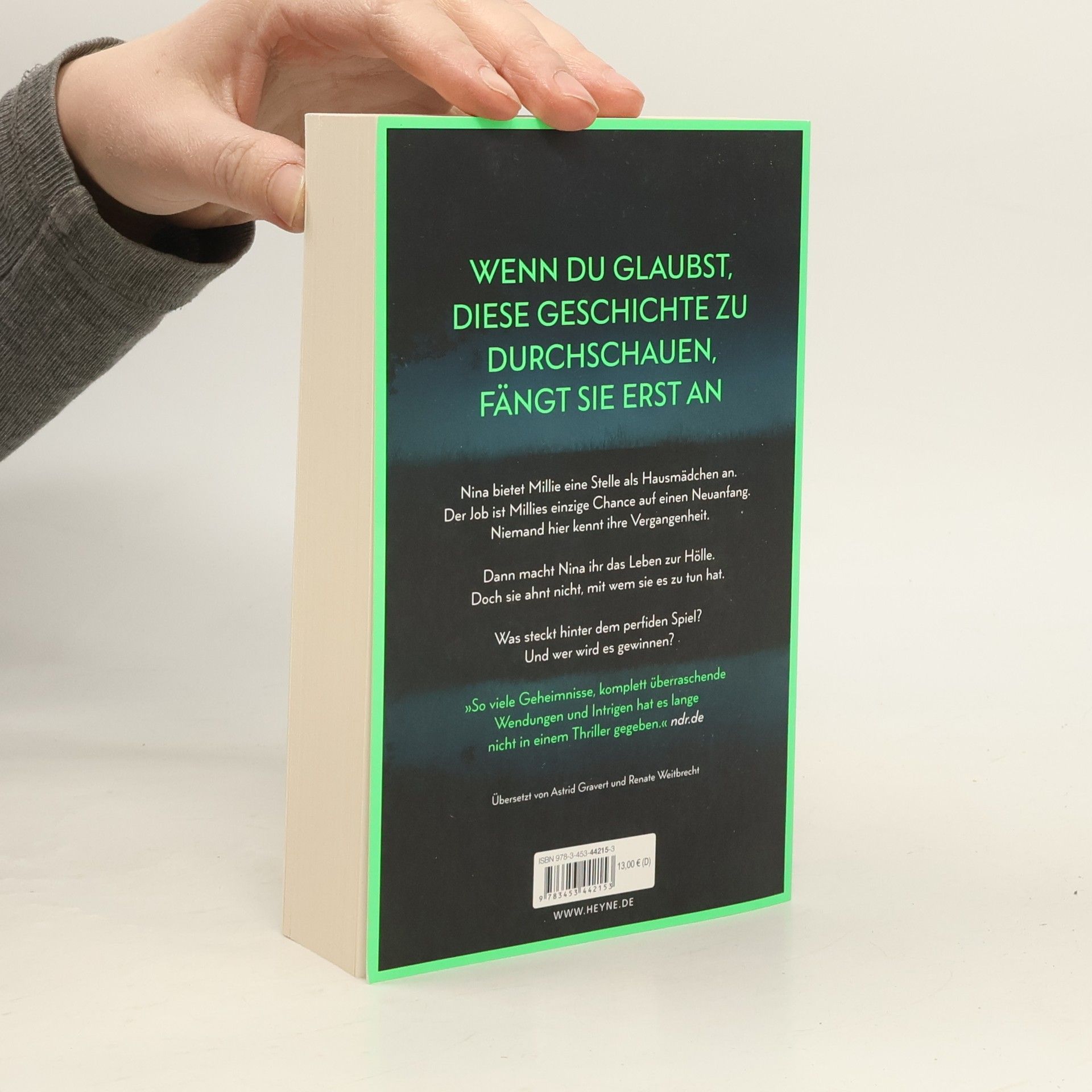 Wenn du glaubst, diese Geschichte zu durchschauen, fängt sie erst an Millie kann ihr Glück kaum fassen, als die elegante Nina ihr die Stelle als Haushaltshilfe inklusive Kost und Logis bei ihrer Familie auf Long Island anbietet. Schließlich hat sie eine Vergangenheit, von der niemand etwas wissen soll. Doch kaum ist Millie eingezogen, zeigt Nina ihr wahres Gesicht: Sie verwüstet das Haus und unterstellt ihr Dinge, die sie nicht getan hat. Ihre verwöhnte Tochter behandelt Millie ohne jeden Respekt. Nur Ninas attraktiver Mann Andrew ist nett zu ihr. Wäre da nur nicht Ninas wachsende Eifersucht. Hat sie Millie nur eingestellt, um ihr das Leben zur Hölle zu machen? Oder hat auch sie ein dunkles Geheimnis, von dem niemand etwas erfahren darf?