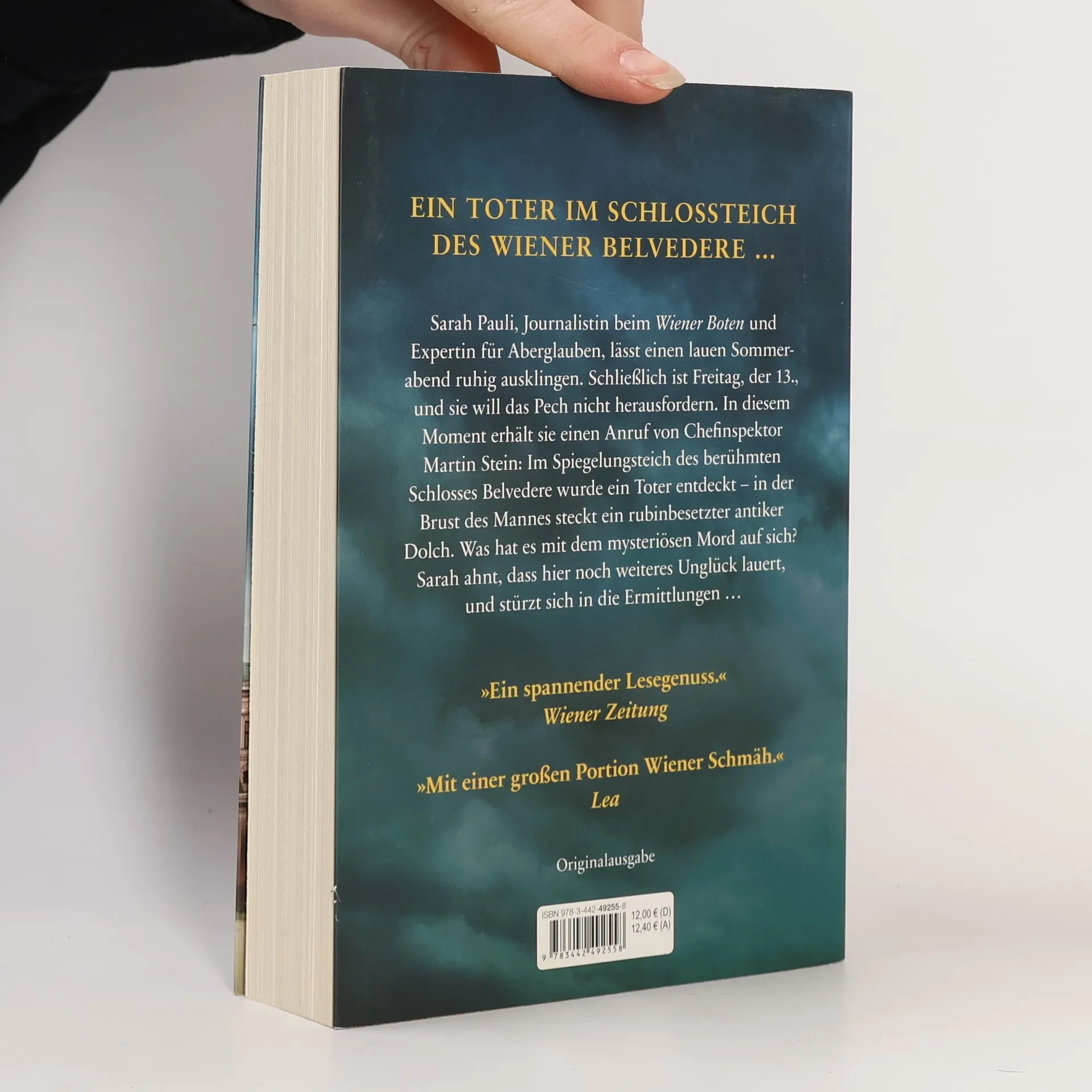 Ein Toter im Schlossteich des Wiener Belvedere – der dreizehnte Fall für die Journalistin Sarah Pauli. Sarah Pauli, Journalistin beim Wiener Boten und Expertin für Aberglauben, lässt einen lauen Sommerabend ruhig ausklingen. Schließlich ist Freitag, der 13., und sie will das Pech nicht herausfordern. In diesem Moment erhält sie einen Anruf von Chefinspektor Martin Stein: Im Spiegelungsteich des berühmten Schlosses Belvedere wurde ein Toter entdeckt – in der Brust des Mannes steckt ein rubinbesetzter antiker Dolch. Was hat es mit dem mysteriösen Mord auf sich? Sarah ahnt, dass hier noch weiteres Unglück lauert, und stürzt sich in die Ermittlungen …