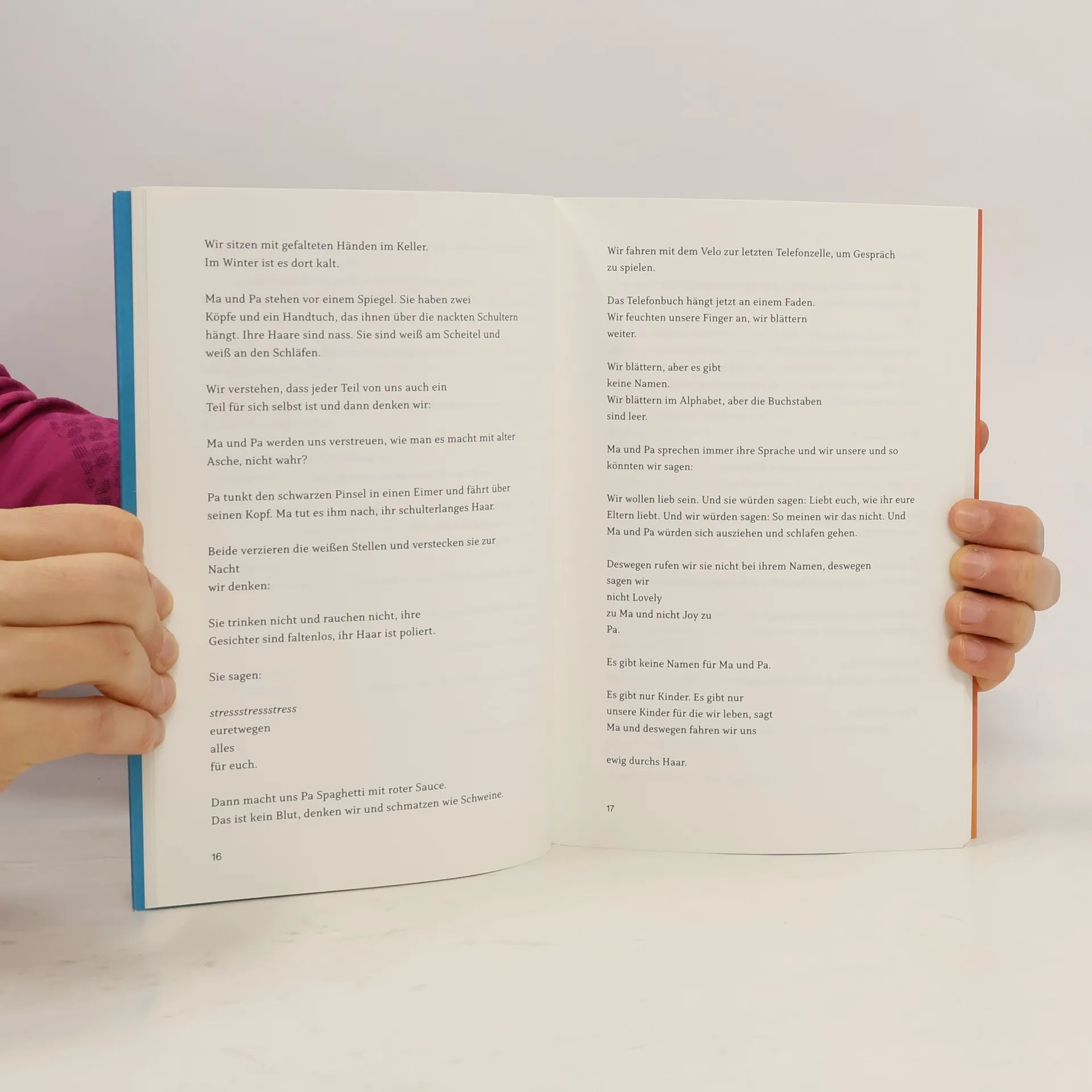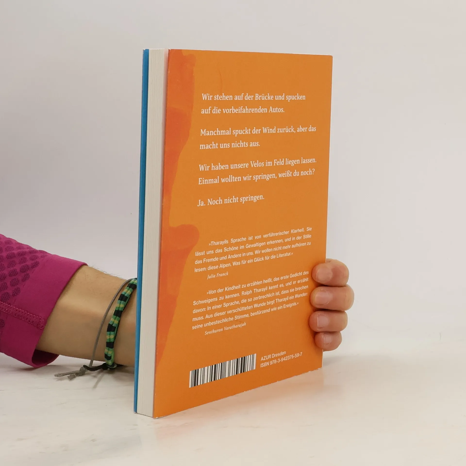 „Nimm die Alpen weg“ erzählt in Bildern die Geschichte einer Kindheit in der Schweiz. Da ist das namenlose Geschwisterpaar, das im Chor spricht. Da ist ein Zuhause mit Ma und Pa, die mit ihren vier Armen wie eine Gottheit erscheinen. Da ist die Geschwindigkeit der Velos, mit denen die Kinder hinaus zu ihren Spielen fahren: zur Telefonzelle, zur Müllhalde, ins Schilf. Und da kommt ein neues Kind in die Klasse, das den Geschwistern einen Weg aus ihrem eigenen, inneren Gebirge bahnt. In einer lyrisch-luziden Prosa entwickelt Ralph Tharayil eine unvergleichliche Coming-of-Age-Geschichte, die von den Formen und Deformationen der Integrationserfahrung erzählt, und von der Sprache und den Körpern, die sich dieser Erfahrung widersetzen.