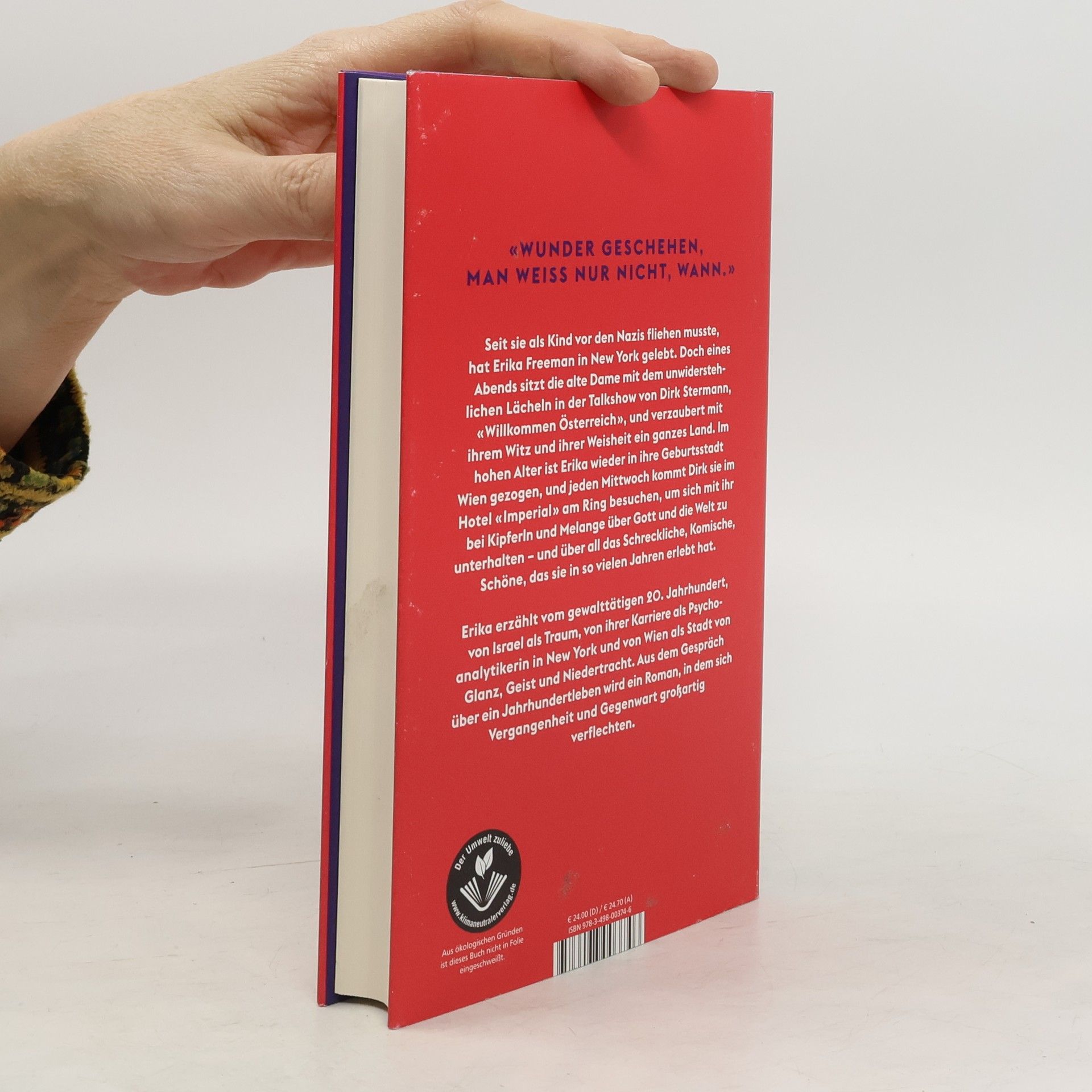 Fast ihr ganzes Leben hat Erika Freeman in New York verbracht, dann sitzt sie eines Abends in der Talkshow von Dirk Stermann, «Willkommen, Österreich», und verzaubert ihren Gastgeber und die Nation. Im hohen Alter lebt sie wieder in ihrer Heimatstadt Wien, jeden Mittwoch kommt Dirk sie nun besuchen, um sich mit ihr bei Kipferln und Melange über Gott und die Welt zu plaudern, und aus diesem erzählten Jahrhundertleben einen so amüsanten wie bewegenden Roman zu machen Geboren 1927, ist Erika mit 12 Jahren vor den Nazis nach New York geflohen. Sie wächst in einem Waisenhaus auf, hat Anteil an der Gründung Israels und wird nach dem Studium Psychoanalytikerin; ganz auf sich gestellt, ihre Mutter hat den Krieg nicht überlebt. Ihr Vater, vermeintlich im KZ gestorben, glaubt seinerseits, als Einziger der Familie überlebt zu haben, bis er mitten auf dem Broadway seinen Bruder trifft. Als Therapeutin ist Erika bald eine Berühmtheit, die Riege ihrer berühmten Patienten reicht von Washington bis Hollywood. Nun, mit 95, ist sie wieder Österreicherin geworden, residiert im berühmten Hotel Imperial, wo einst Hitler nächtigte, und wenn man sie fragt, wie es ihr geht, sagt sie: «Gut. Wenn nicht heute, dann morgen.»