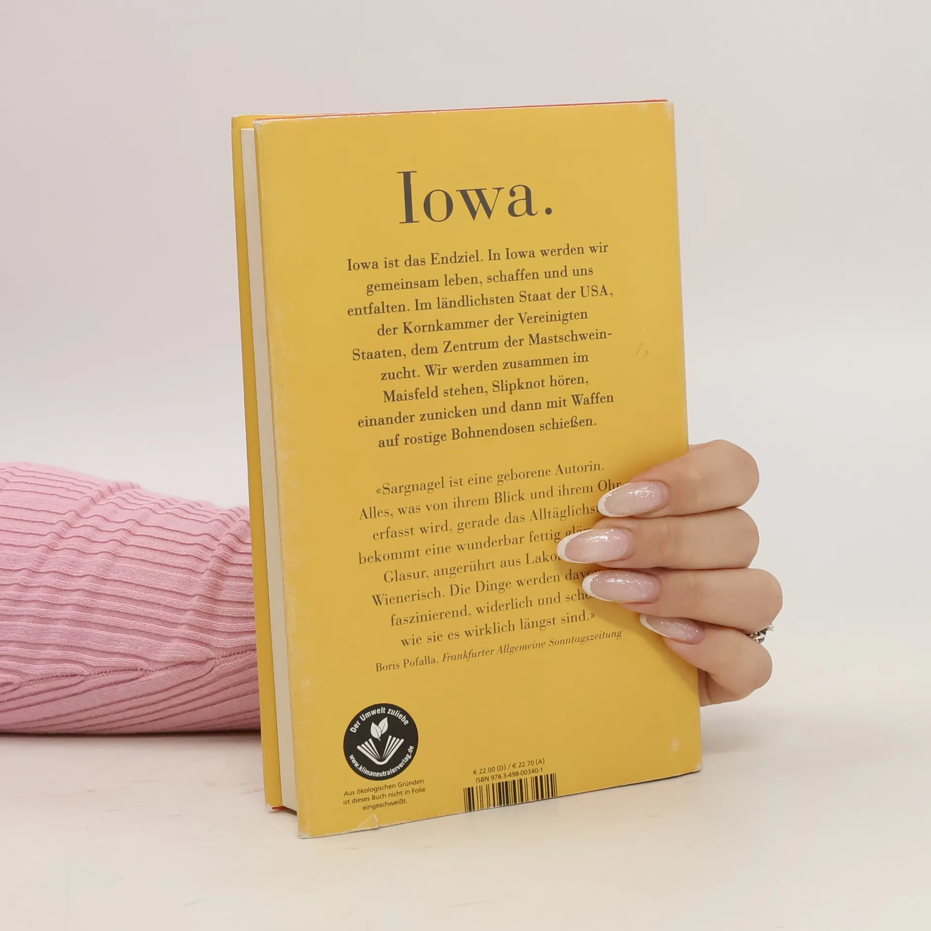 Das neue Buch der österreichischen Bestsellerautorin („Dicht“). Stefanie Sargnagels Blick auf die USA ist so unverwechselbar wie ihr Schreiben: Sarkastisch, schonungslos ehrlich und doch voll Sympathie bringt sie uns das ländliche Amerika nahe und berichtet nebenbei herzerwärmend über die Lebensnotwendigkeit von Frauenfreundschaften. 2022 tauscht Stefanie Sargnagel widerstrebend das bequeme Wiener Sofa gegen ein Flugticket in die USA ein. In Iowa soll sie an einem College mitten im Nirgendwo Creative Writing unterrichten. In der Kleinstadt Grinnell mit ihren 8000 Einwohnern gibt es außer endlosen Maisfeldern: nichts. Mit von der Partie ist Musiklegende Christiane Rösinger, und gemeinsam machen die beiden sich auf, das Nichts zu erkunden. Sie finden übergewichtige freundliche Einheimische, traditionelle Geschlechterrollen, Riesensupermärkte, unglaubliche Würstchen und ein Glas voller eingelegter Truthahnmägen. Mit korrigierenden Fußnoten von Christiane Rösinger.