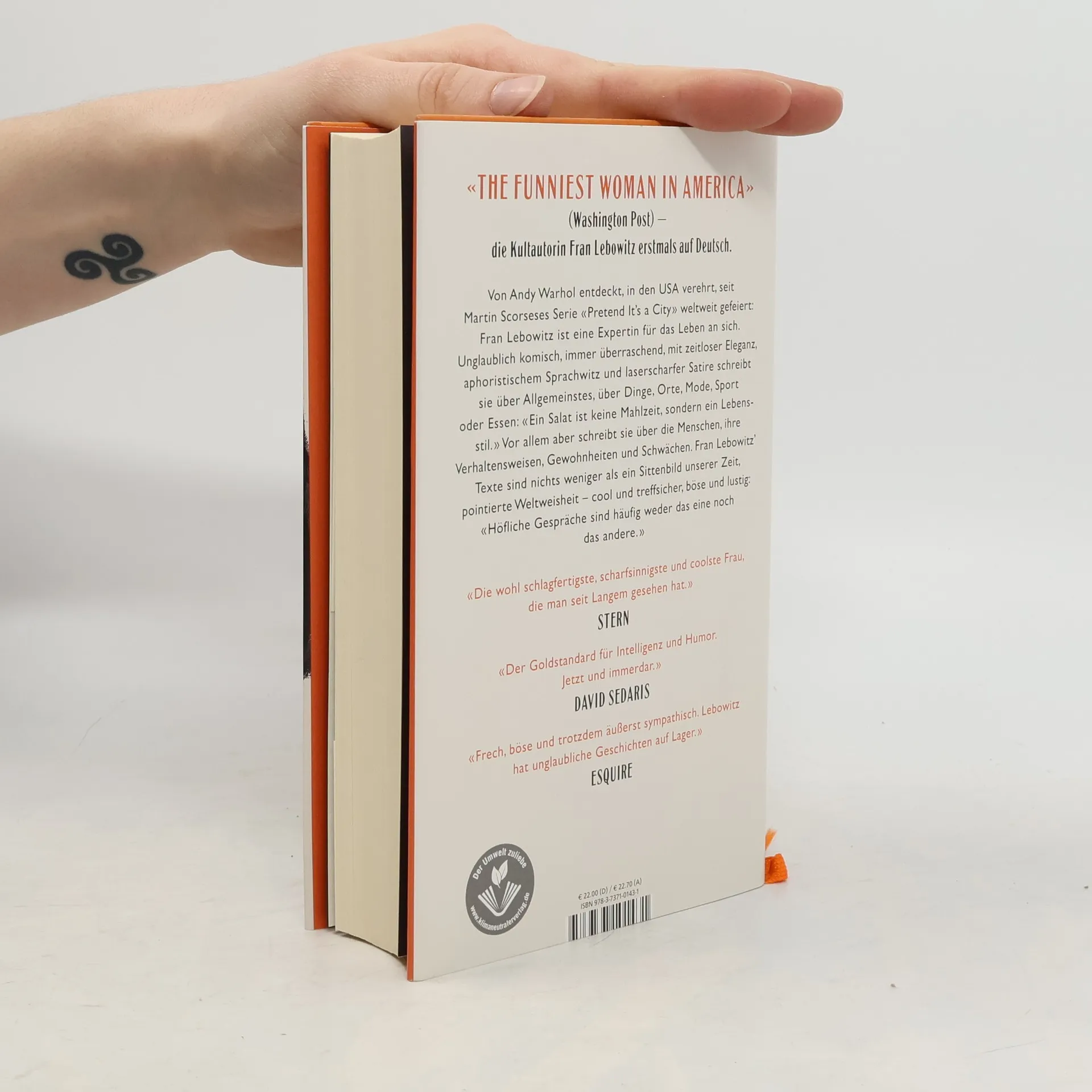 Von Andy Warhol entdeckt, als Stilikone und Talkgast verehrt, ist Fran Lebowitz in den USA eine Kultfigur. Mit der Netflix-Serie «Pretend It’s a City» ihres Freundes Martin Scorsese wird sie weltweit gefeiert. Lebowitz’ Ruhm begründet aber hat ihr Schreiben, das sie als ebenso aufmerksame wie weise Beobachterin der Menschen und ihres Alltags zeigt. Unglaublich komisch, immer überraschend, mit zeitloser Eleganz, aphoristischem Sprachwitz und laserscharfer Satire schreibt sie über Allgemeinstes, «Dinge», «Orte», «Pflanzen», «Ideen», vor allem aber über Menschliches, ob «Leute», «Affären», «Benehmen» oder auch «Kinder: pro oder contra?». Vielleicht kann nur die Welthauptstadt New York so eine Beobachtungsgabe hervorbringen. Denn alle unsere Fragen und Probleme – Selbstoptimierung, Körperkult, Kindererziehung, unbezahlbare Wohnungen, Eitelkeit und gnadenlose Angeberei als Karrierebooster etwa – sind dort schon immer so virulent wie heute überall: «Ein Salat ist keine Mahlzeit, sondern ein Lebensstil.» – Diese Autorin kennt die Menschen und vor allem ihre Schwächen, ihre grandiosen Texte sind nichts weniger als ein Sittenbild unserer Zeit, pointierte Weltweisheit: cool und treffsicher, böse und lustig.