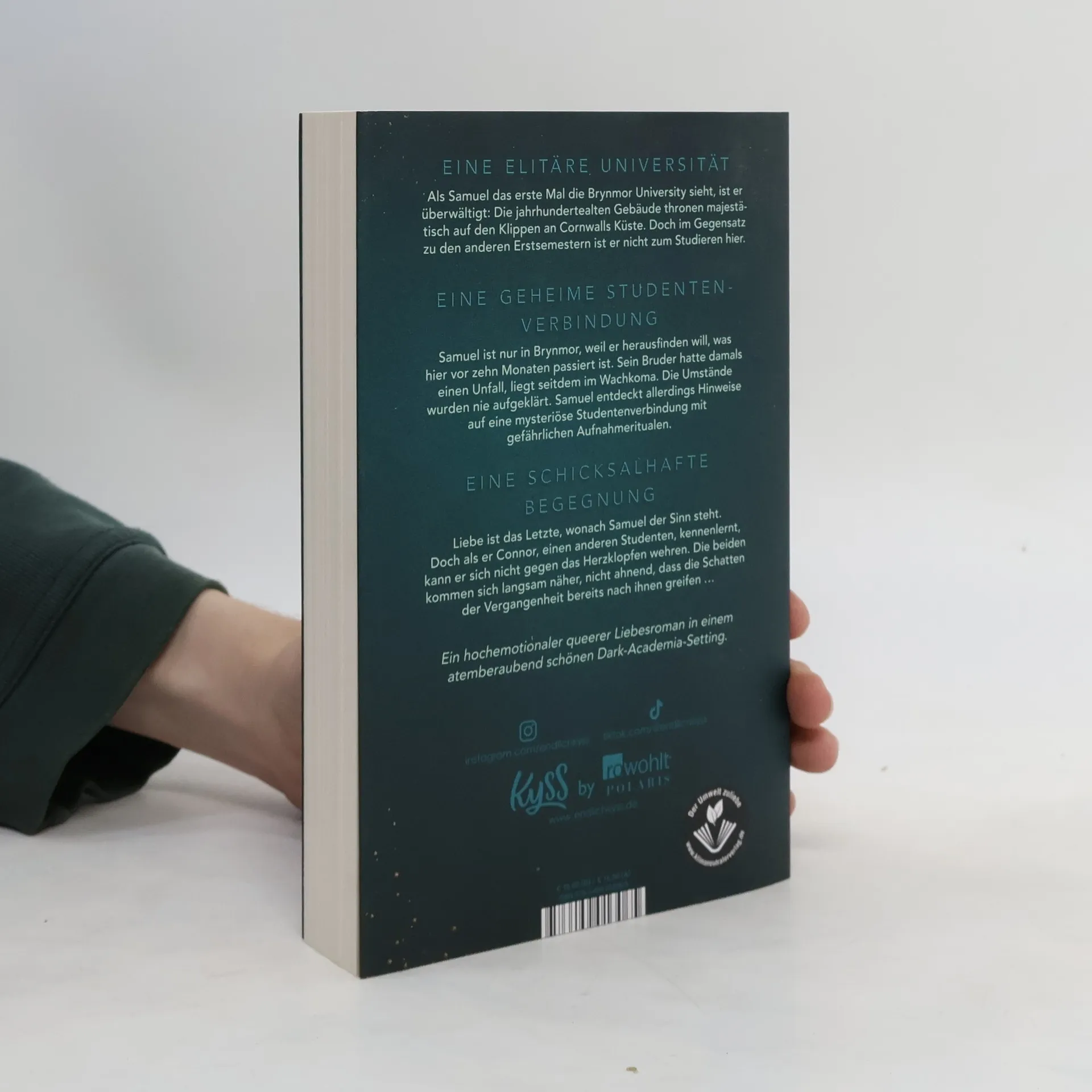 Ein hochemotionaler queerer Liebesroman in einem atemberaubend schönen Dark-Academia-Setting. EINE ELITÄRE UNIVERSITÄT Als Samuel das erste Mal die Brynmor University sieht, ist er überwältigt: Die jahrhundertealten Gebäude thronen majestätisch auf den Klippen an Cornwalls Küste. Doch im Gegensatz zu den anderen Erstsemestern ist er nicht zum Studieren hier. EINE GEHEIME STUDENTENVERBINDUNG Samuel ist nur in Brynmor, weil er herausfinden will, was hier vor zehn Monaten passiert ist. Sein Bruder hatte damals einen Unfall, liegt seitdem im Wachkoma. Die Umstände wurden nie aufgeklärt. Samuel entdeckt allerdings Hinweise auf eine mysteriöse Studentenverbindung mit gefährlichen Aufnahmeritualen. EINE SCHICKSALHAFTE BEGEGNUNG Liebe ist das Letzte, wonach Samuel der Sinn steht. Doch als er Connor, einen anderen Studenten, kennenlernt, kann er sich nicht gegen das Herzklopfen wehren. Die beiden kommen sich langsam näher, nicht ahnend, dass die Schatten der Vergangenheit bereits nach ihnen greifen …