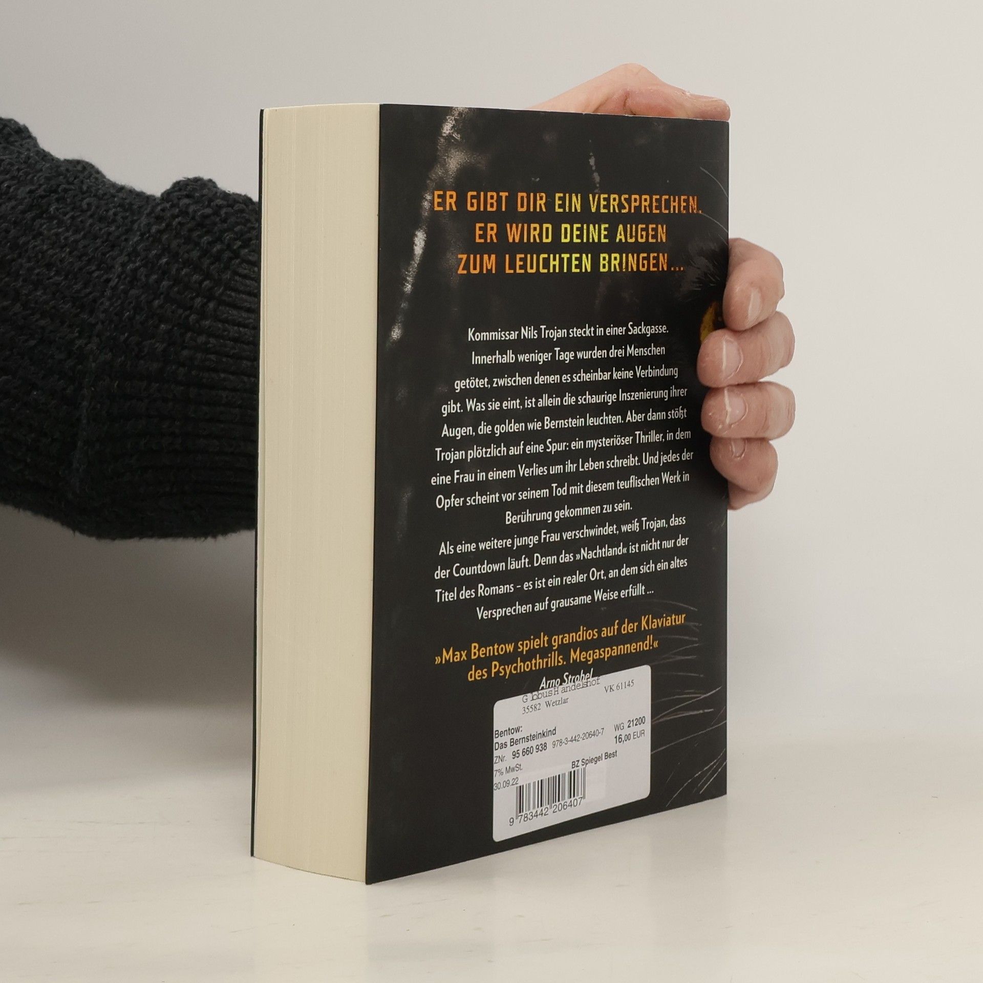 Kommissar Nils Trojan steckt in einer Sackgasse. Innerhalb weniger Tage wurden drei Menschen getötet, zwischen denen es scheinbar keine Verbindung gibt. Was sie eint, ist allein die schaurige Inszenierung ihrer Augen, die golden wie Bernstein leuchten. Aber dann stößt Trojan plötzlich auf eine Spur: ein mysteriöser Thriller, in dem eine Frau in einem Verlies um ihr Leben schreibt. Und jedes der Opfer scheint mit diesem teuflischen Werk vor seinem Tod in Berührung gekommen zu sein. Als eine weitere junge Frau verschwindet, weiß Trojan, dass der Countdown läuft. Denn das »Nachtland« ist nicht nur der Titel des Romans – es ist ein realer Ort, an dem sich ein altes Versprechen auf grausame Weise erfüllt ...