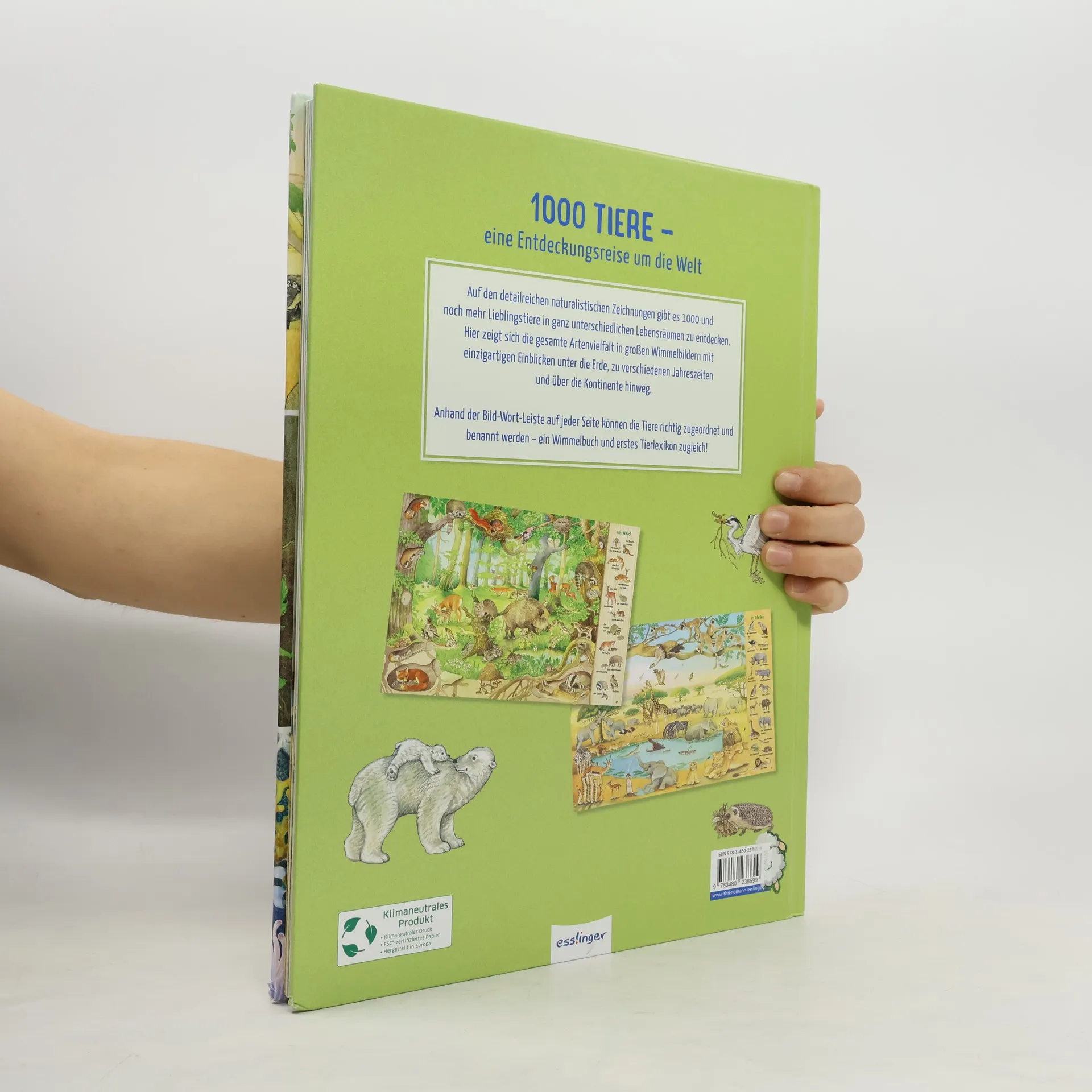 Die ganze Welt der Tiere in einem Band! Für alle Tierfreunde ab 3 Jahren geeignet. In diesem Sammelband gibt es 1000 und noch mehr Lieblingstiere in ganz unterschiedlichen Lebensräumen und in all ihrer Artenvielfalt zu entdecken. Mit den detailreichen naturalistischen Illustrationen werden spannende und faszinierende Einblicke geboten, angefangen bei unseren heimischen Wald- und Wiesentieren zu unterschiedlichen Tag- und Jahreszeiten, über die Kontinente hinweg zu den exotischen Tieren in Afrika, Amerika, Asien und Australien bis hin zu den Tieren am Nord- und Südpol . Von der Ameise bis zum Zebra – anhand der Bild-Wort-Leiste auf jeder Seite können die Tiere außerdem richtig zugeordnet und benannt werden. Ein spektakuläres Wimmelbuch und erstes Tier-Lexikon zugleich! In dieser Serie mit Illustrationen von Christine Henkel bereits erschienen: Mein großes Natur-Wimmelbuch 978-3-480-23608-4 Mein großes Tiere-Wimmelbuch 978-3-480-23708-1