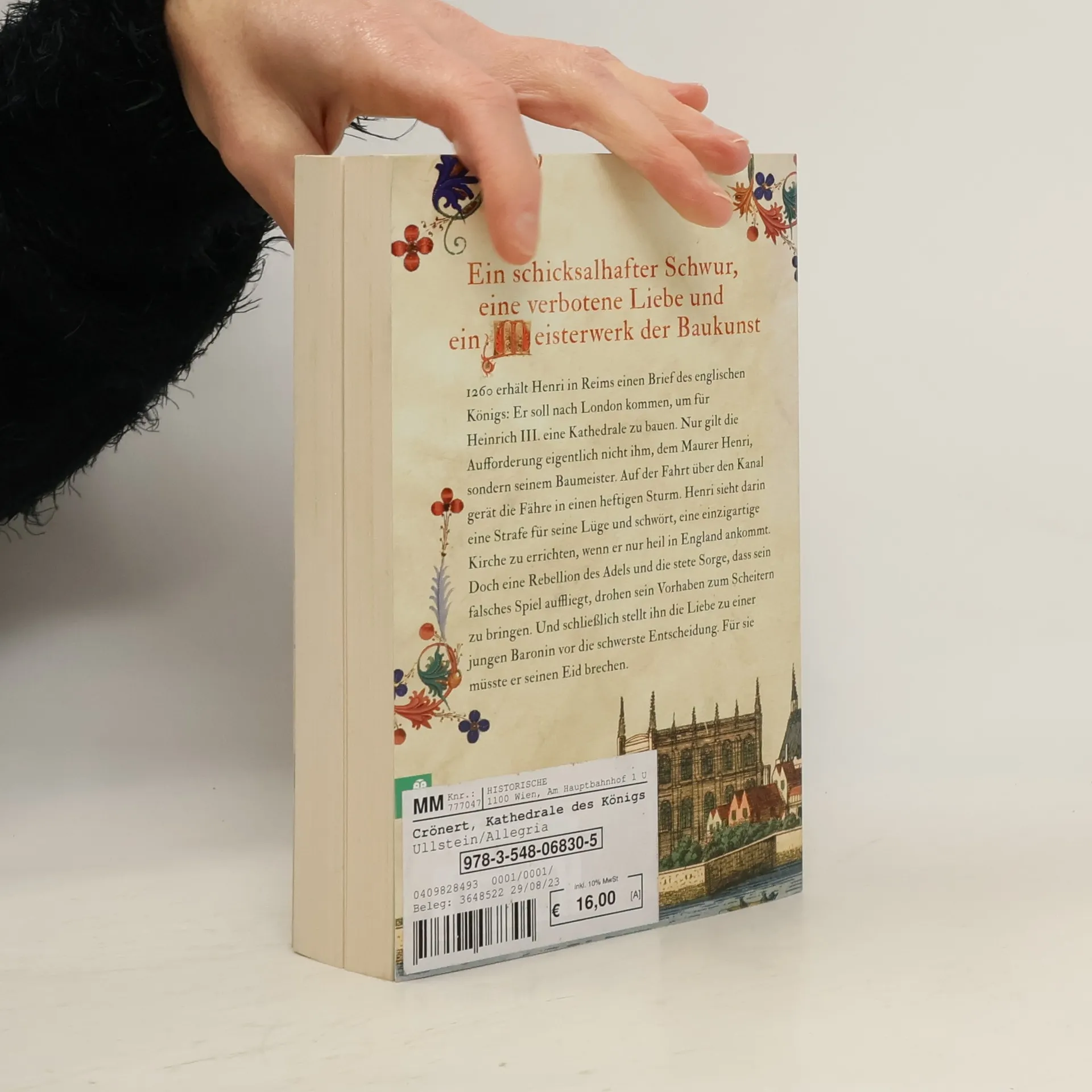 Ein schicksalhafter Schwur, eine verbotene Liebe und ein Meisterwerk der Baukunst 1260 erhält Maurermeister Henri in Reims einen Brief des englischen Königs: Er soll nach London kommen, um für Heinrich III. eine Kathedrale zu bauen. Nur gilt die Aufforderung eigentlich nicht dem Maurer Henri, sondern seinem Baumeister. Auf der Fahrt über den Kanal gerät die Fähre in einen heftigen Sturm. Henri sieht darin eine Strafe für seine Lüge und schwört, eine einzigartige Kirche zu schaffen, wenn er nur heil in England ankommt. Doch brüchige Fundamente, eine Rebellion des Adels und die stete Sorge, dass sein falsches Spiel auffliegt, drohen sein Vorhaben zum Scheitern zu bringen. Dann stellt ihn die Liebe zu einer jungen Baronin vor die schwerste Herausforderung: Kann er ihre Liebe beschützen, ohne seinen Eid zu brechen? Die Westminster Abbey ist seit dem Jahr 1066 Krönungskirche und letzte Ruhestätte für mehr als 3.000 Briten. Auch heute noch werden in der Kirche die großen Ereignisse Großbritanniens gefeiert, im Mai 2023 die Krönung Charles III.