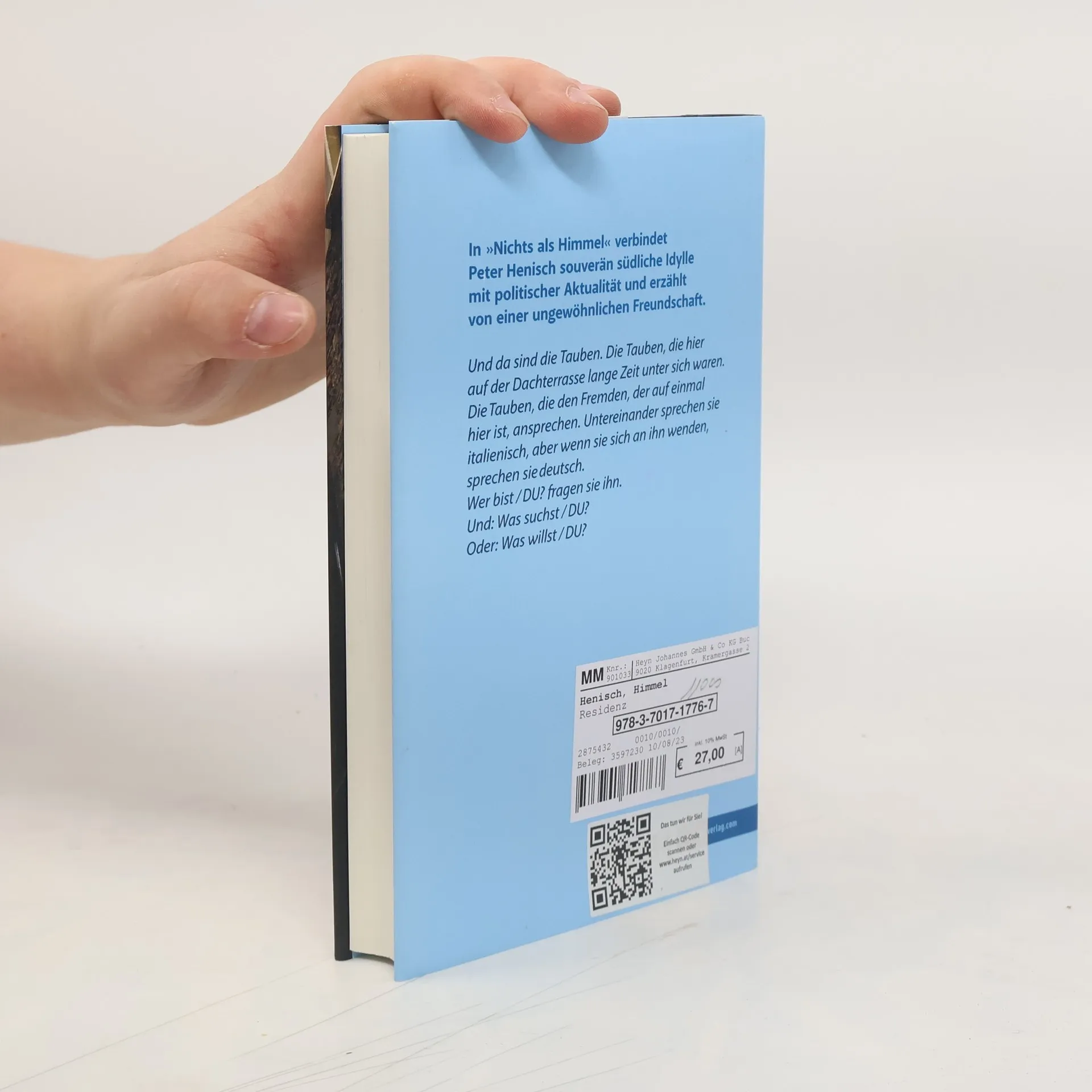 Mit „Nichts als Himmel“ kehrt Peter Henisch an seinen Sehnsuchtsort San Vito zurück, in die versteckte Wohnung unter den Dächern der italienischen Kleinstadt. Für den Musiker Paul Spielmann, der vor Pandemie und Lebenskrise aus Wien flüchtet, wird sie zum Refugium. Abends auf seiner Terrasse kommt Paul zur Ruhe, er beginnt Wolkenmetamorphosen und Vogelschwarmflüge zu fotografieren, bis plötzlich ein Mann über die Dächer kommt, einer der Clandestini, der Flüchtlinge aus Afrika, gegen die die rechte Hetze in Italien immer lauter wird. „Gimme shelter“, fleht der Mann, und Paul nimmt ihn auf und hilft ihm. Und schon wird er hineingezogen in einen Strudel aus zwiespältigen Gefühlen, politischer Stimmungsmache – und in die wachsende Freundschaft mit Abdallah …