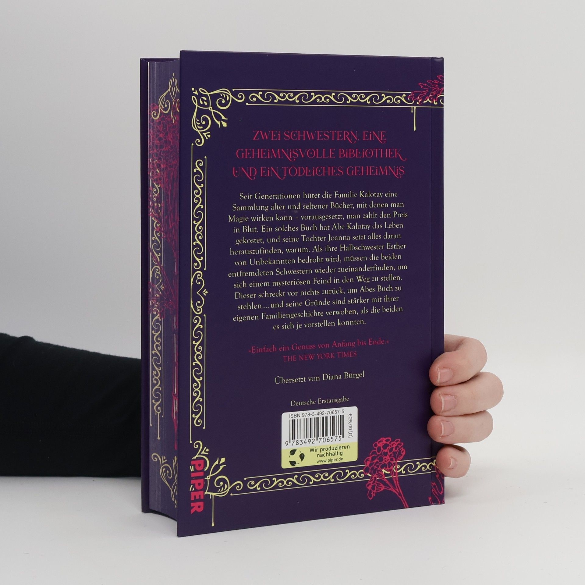 Bücher, in Blut geschrieben. Spiegel, durch die mysteriöse Verfolger jeden Schritt beobachten. Und eine magische Bibliothek voller Geheimnisse. Seit Generationen hütet die Familie Kalotay eine Sammlung alter und seltener Bücher. Bücher, mit denen man Magie wirken kann – vorausgesetzt, man zahlt den Preis in Blut. Ein solches Buch hat Abe Kalotay das Leben gekostet, und seine Tochter Joanna setzt alles daran, herauszufinden, warum. Als ihre Halbschwester Esther von Unbekannten bedroht wird, müssen die beiden entfremdeten Schwestern wieder zueinander finden, um sich einem mysteriösen Feind in den Weg zu stellen. Doch dieser schreckt vor nichts zurück, um Abes Buch zu stehlen – nicht einmal vor Mord. »Einfach ein Genuss von Anfang bis Ende.« The New York Times