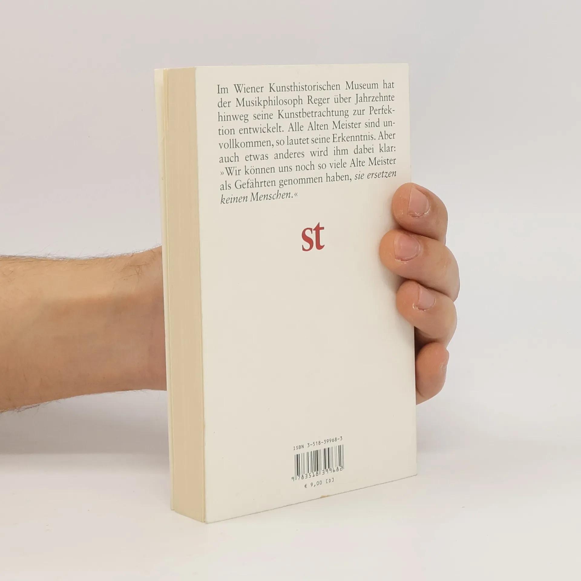 Das Durchbrechen einer jahrzehntealten Gewohnheit führt in dem 1985 zuerst erschienenen Prosaband mit dem Untertitel »Komödie« von Thomas Bernhard dazu, daß der Privatgelehrte Atzbacher und der Musikphilosoph Reger sich an zwei aufeinanderfolgenden Tagen im Wiener Kunsthistorischen Museum treffen. Atzbacher nimmt diese außergewöhnliche Verabredung zum Anlaß, den in seine Betrachtung versunkenen Reger zu beobachten. Der Zweiundachtzigjährige, der seit dreißig Jahren aus Wien für die Times Musikkritiken schreibt, hat im Kunsthistorischcn Museum seine Kunstbetrachtung zur Perfektion entwickelt: Sie besteht darin, jedes Kunstwerk, das für vollendet gehalten wird, so lange zu studieren, bis dessen Fehler aufgedeckt sind. Alle Alten Meister und Großen Geister sind unvollkommen. Daß Kunst, Musik, Philosophie und Literatur jedoch nicht das »Höchste, Allerhöchste« sind, wird Reger bewußt, als seine Frau stirbt, mit der er mehr als drei Jahrzehnte verheiratet war.