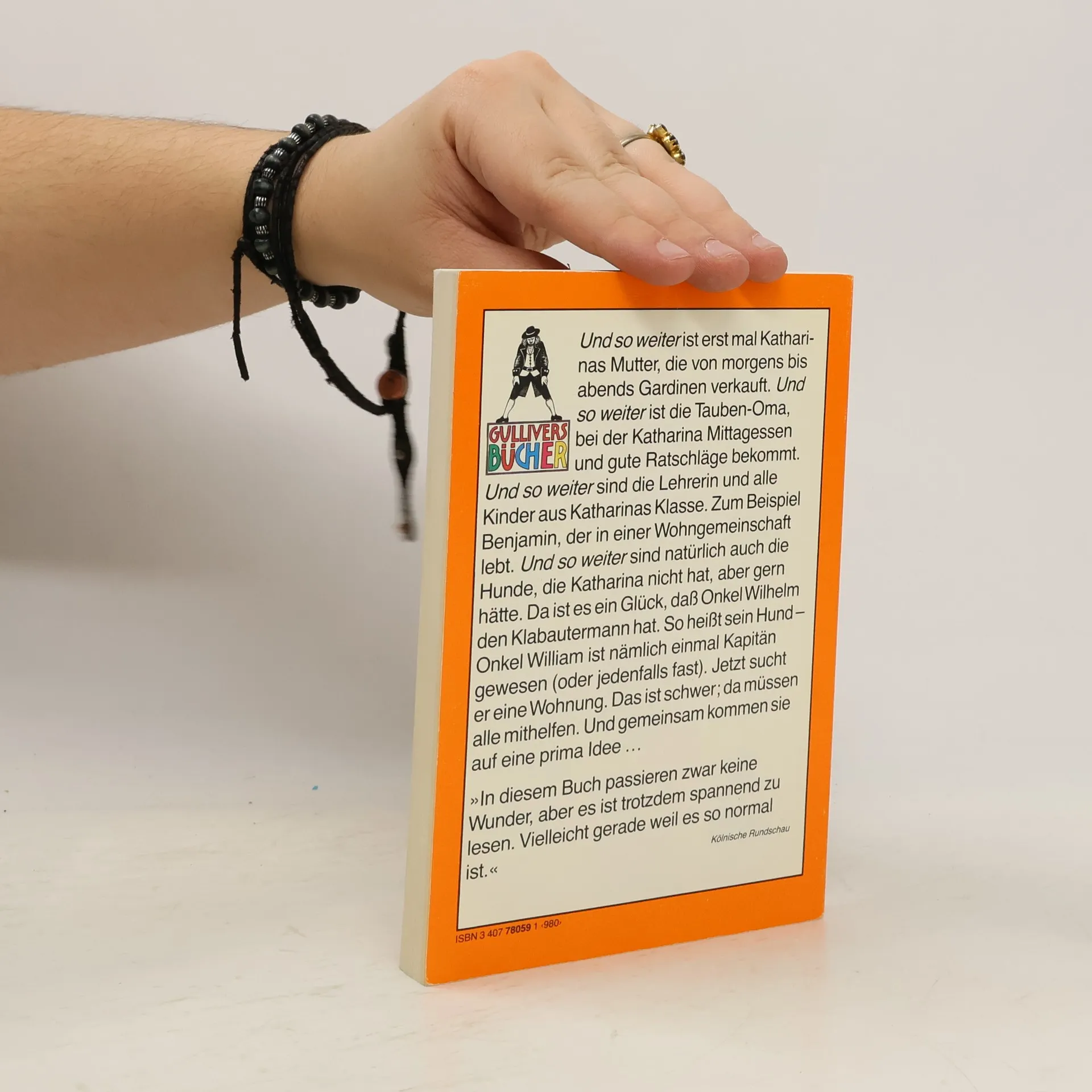 Katharina und ihr kunterbuntes Leben. Und so weiter ist Katharinas Mutter, die von morgens bis abends Gardinen verkauft, Und so weiter ist die Tauben-Oma, bei der Katharina Mittagessen und gute Ratschläge bekommt. Und so weiter sind die Lehrerin und alle Kinder aus Katharinas Klasse. Zum Beispiel Benjamin, der in einer Wohngemeinschaft lebt. Und so weiter sind natürlich auch die Hunde, die Katharina nicht hat, aber gern hätte. Da ist es ein Glück, daß Onkel Wilhelm den Klabautermann hat. So heißt sein Hund. Onkel William ist nämlich einmal Kapitän gewesen (oder jedenfalls fast). Jetzt sucht er eine Wohnung. Das ist schwer, da müssen alle mithelfen. Und gemeinsam kommen sie auf eine prima Idee...
