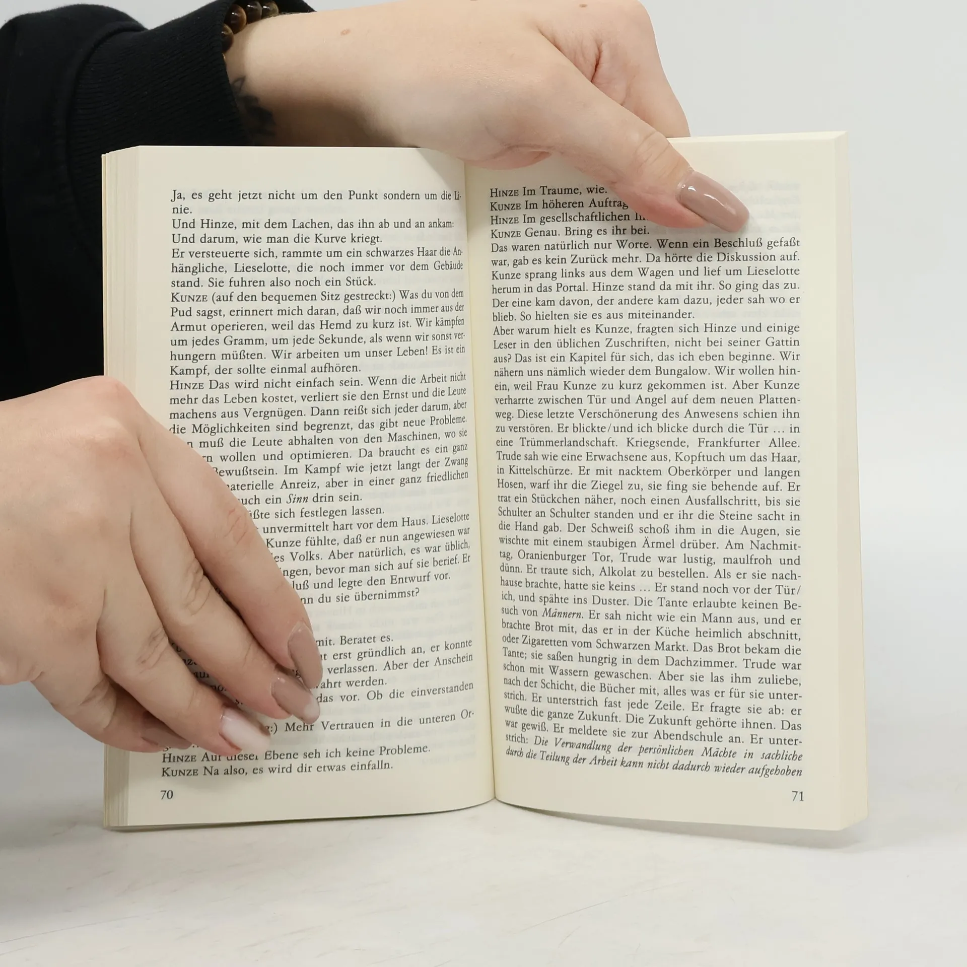 „Das ist der Roman von Hinze und Kunze. Wer sind Hinze und Kunze? Wie die Redensart es will und der Sozialismus, sollten sie Gleiche sein; um so auffälliger, daß sie es nicht sind. Kunze ist Funktionär, Hinze ist sein Fahrer. Kunze sagt wohin: und Hinze fährt davon.“