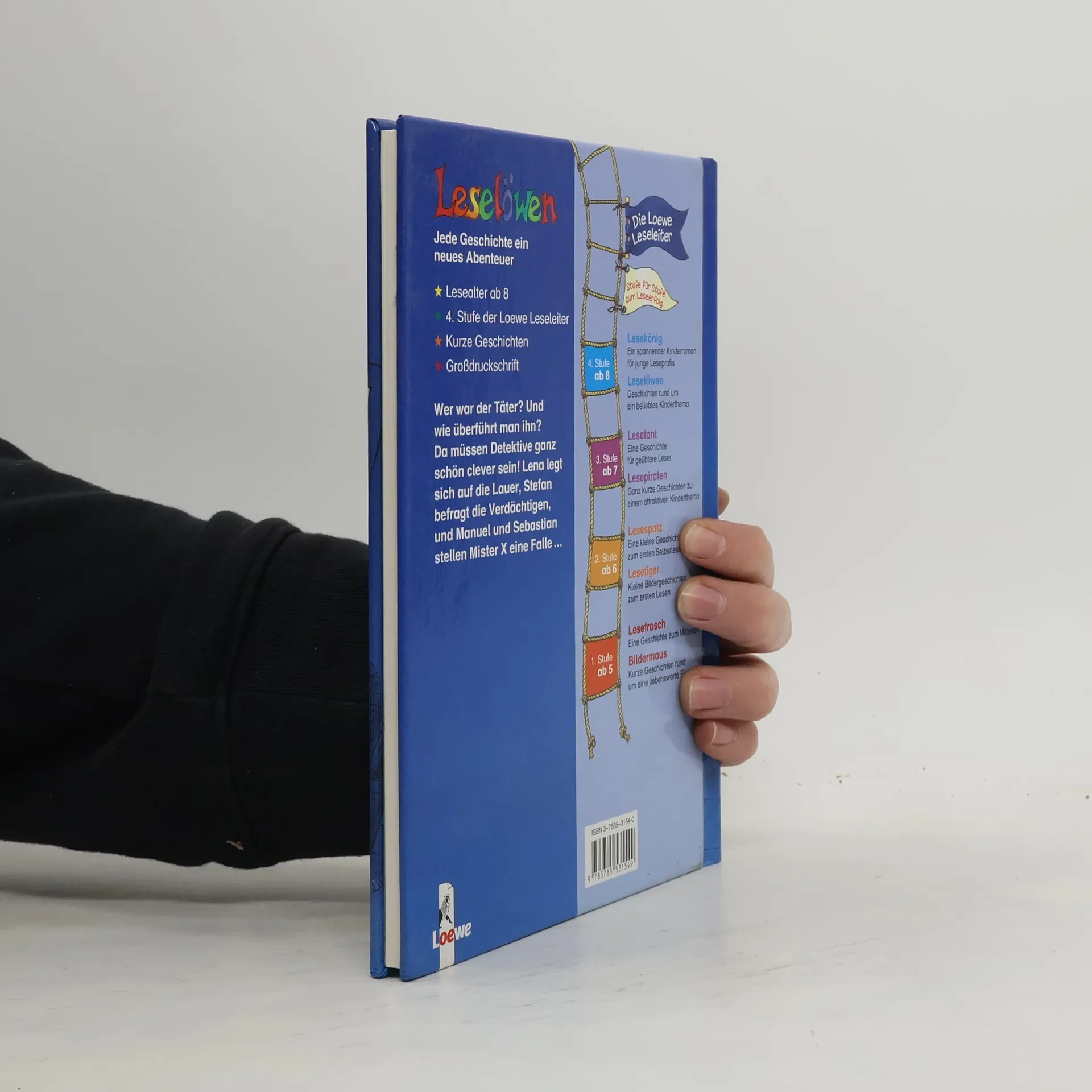 Lesealter ab 8 4. Stufe der Loewe-Leseleiter Kurze Geschichten Großdruckschrift. Wer war der Täter? Und wie überführt man ihn? Da müssen Detektive ganz schön clever sein! Axel und Kevin legen sich auf die Lauer, Stefan befragt die Verdächtigen, und Manuel und Sebastian stellen Mister X eine Falle.