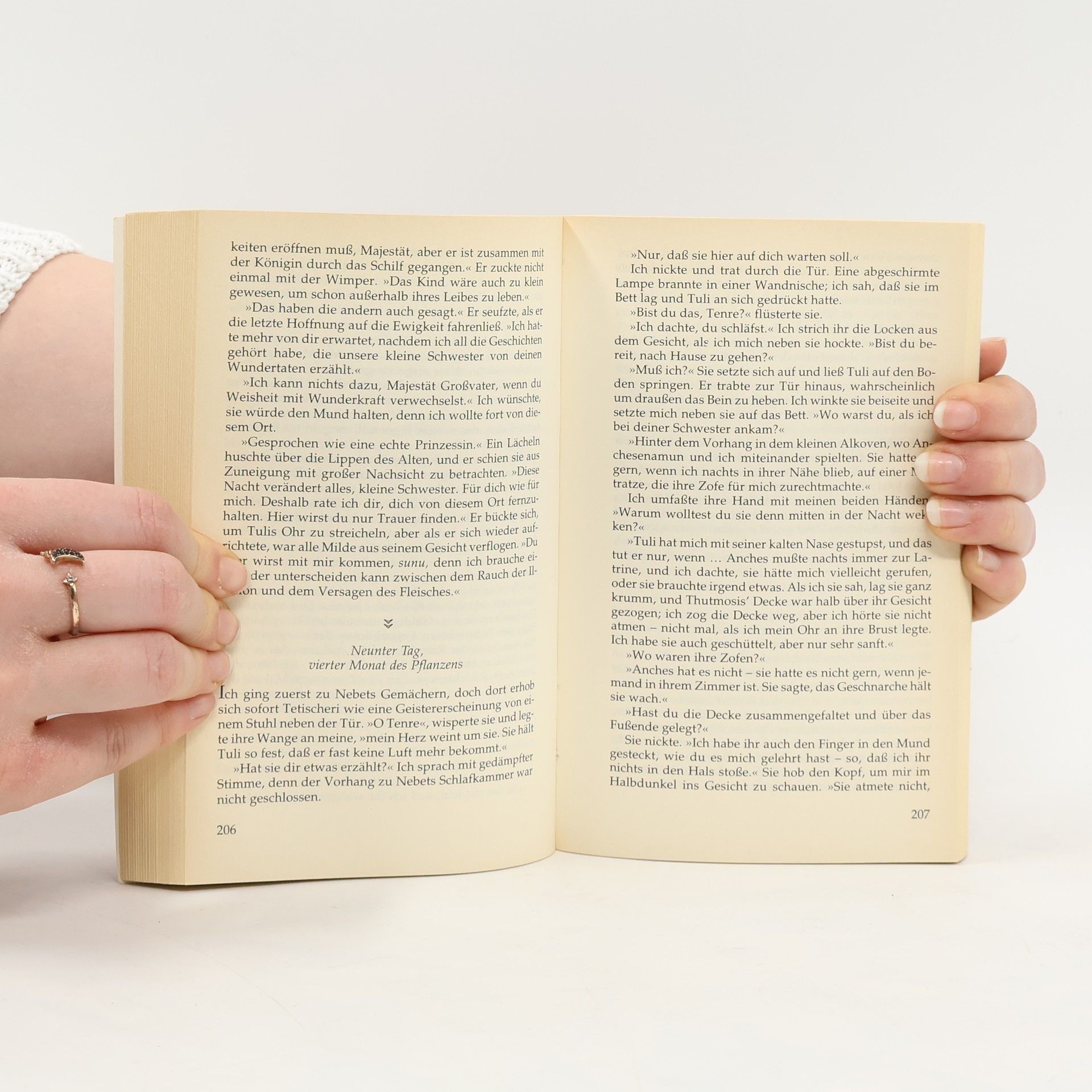 Eine große Liebe im alten Ägypten und ihr geheimnisvoller Widerhall in unserer Zeit Dieser spannende, manchmal unheimliche Roman erzählt die Geschichte der Liebe des Arztes Senakhtenre zu Aset, einer Tochter Nofretetes, und wie sich diese Liebesgeschichte 33 Jahrhunderte später im Schicksal einer jungen Frau widerspiegelt. Senakhtenre, genannt sunu, ist ein junger Arzt, der mehr auf seinen Verstand und die praktischen Heilmethoden des Volkes vertraut als auf die religiösen Rituale der Priester. Als er in den Palast des Hohenpriesters Ramose geholt wird, ahnt er, daß ihm Ungewöhnliches bevorsteht. Aber erst als er erkennt, daß die Gebärende, der er helfen soll, niemand anders ist als die schöne Nofretete, einst königliche Gemahlin des häretischen Pharaos Echnaton, weiß er, in welch lebensgefährliche Machenschaften er verwickelt wird. Nur zu offensichtlich ist, daß die Tochter des Priesters und der ehemaligen Königin, die er ins Leben holt und der später der Name Aset gegeben wird, als Faustpfand dienen soll im Kampf um den Thron der Pharaonen. Aset erobert als junge Frau das Herz Senakhtenres und später, als Künstlerin, das Herz des ägyptischen Volkes: Mit ihren Bildergeschichten prangert sie die verbrecherischen Intrigen derer an, die um den Thron der Pharaonen kämpfen, auch die Intrigen ihrer eigenen Mutter. Am Ende büßt sie mit dem Leben, und mit ihr und der Rache ihres Mannes Senakhtenre geht die glorreiche Herrschaft der 18. Dynastie Altägyptens zu Ende. Mehr als 33 Jahrhunderte später erinnert sich Kate McKinnon an Menschen, die sie nie gekannt, an Plätze, die sie nie gesehen hat, und an Ereignisse, die niemals stattgefunden haben - zumindest nicht in ihrer Gegenwart. Sie ist von einem Museum in Denver beauftragt worden, eine Ausstellung altägyptischer Mumien zu gestalten. Als die Durchleuchtung der Mumie einer jungen Frau zeigt, daß deren Skelett schon vor der Einbalsamierung schwer beschädigt war und daß man ihr den Kopf eines Mannes zwischen die Beine gelegt hatte, verfällt Kate immer mehr der Faszination dieses Geheimnisses. Carol Thurston ist Kommunikationswissenschaftlerin und hat als Zeitungsreporterin, als Wissenschaftsjournalistin und Universitätsprofessorin gearbeitet. Sie wurde in Chicago geboren und lebt zur Zeit mit ihrem Mann, einem Naturwissenschaftler, in Austin, Texas. Eine Liebe für die Ewigkeit ist ihr dritter Roman.