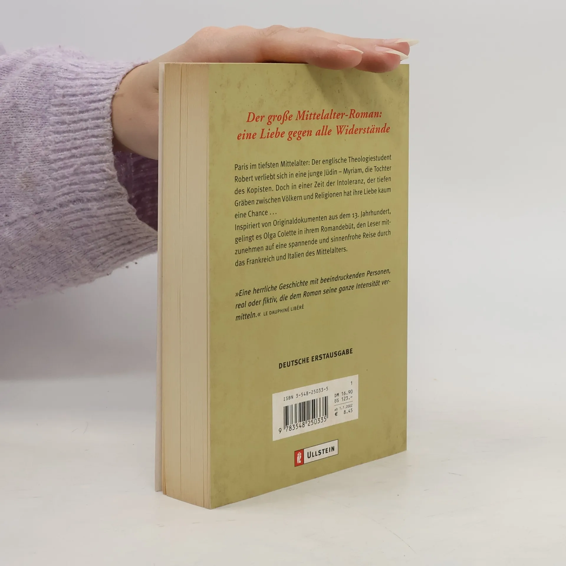 Paris im tiefsten Mittelalter: Der englische Theologiestudent Robert verliebt sich in eine junge Jüdin - Myriam, die Tochter des Kopisten. Doch in einer Zeit der Intoleranz, der tiefen Gräben zwischen Völkern und Religionen hat ihre Liebe kaum eine Chance ... Inspiriert von Originaldokumenten aus dem 13. Jahrhundert gelingt es Olga Colette in ihrem Romandebüt, den Leser mitzunehmen auf eine spannende und sinnenfrohe Reise durch das Frankreich und Italien des Mittelalters.