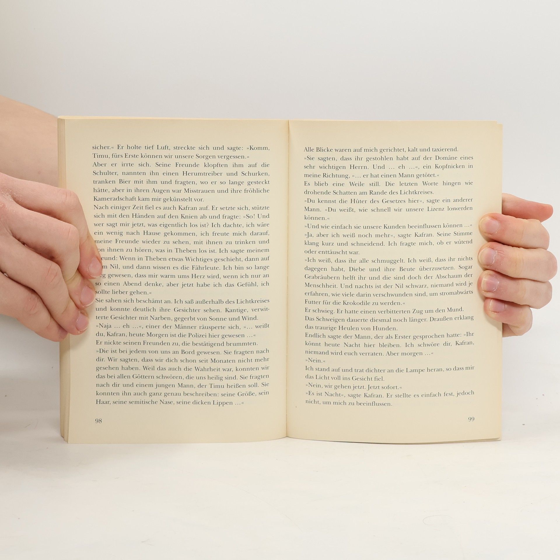 Ein Roman aus dem alten Ägypten, eine Geschichte über Intrigen und Übergriffe und eine lange, gefahrvolle Flucht. Als er auf einer Sandbank am Nilufer zur Besinnung kommt, hat er stechende Kopfschmerzen und kann sich an nichts mehr erinnern. Kafran rettet ihn im letzten Augenblick vor den Krokodilen. Timu, wie Kafran ihn schließlich nennt, sollte ganz offensichtlich ermordet werden. Zusammen machen sich die beiden auf, um Timus geheimnisvoller Vergangenheit auf die Spur zu kommen. Ihr Weg führt sie durch Wüsten und übers Meer, in verlassenen Ruinen und ausgetrocknete Täler, und nur allmählich, Stück für Stück, kehrt Timus Gedächtnis zurück. Wie Teile aus einem komplizierten Puzzle kann er schließlich seine Vergangenheit zusammensetzen. Dabei hilft ihm auch Anuk, das kluge Mädchen mit den schönen großen Augen, in die er sich unsterblich verliebt hat.