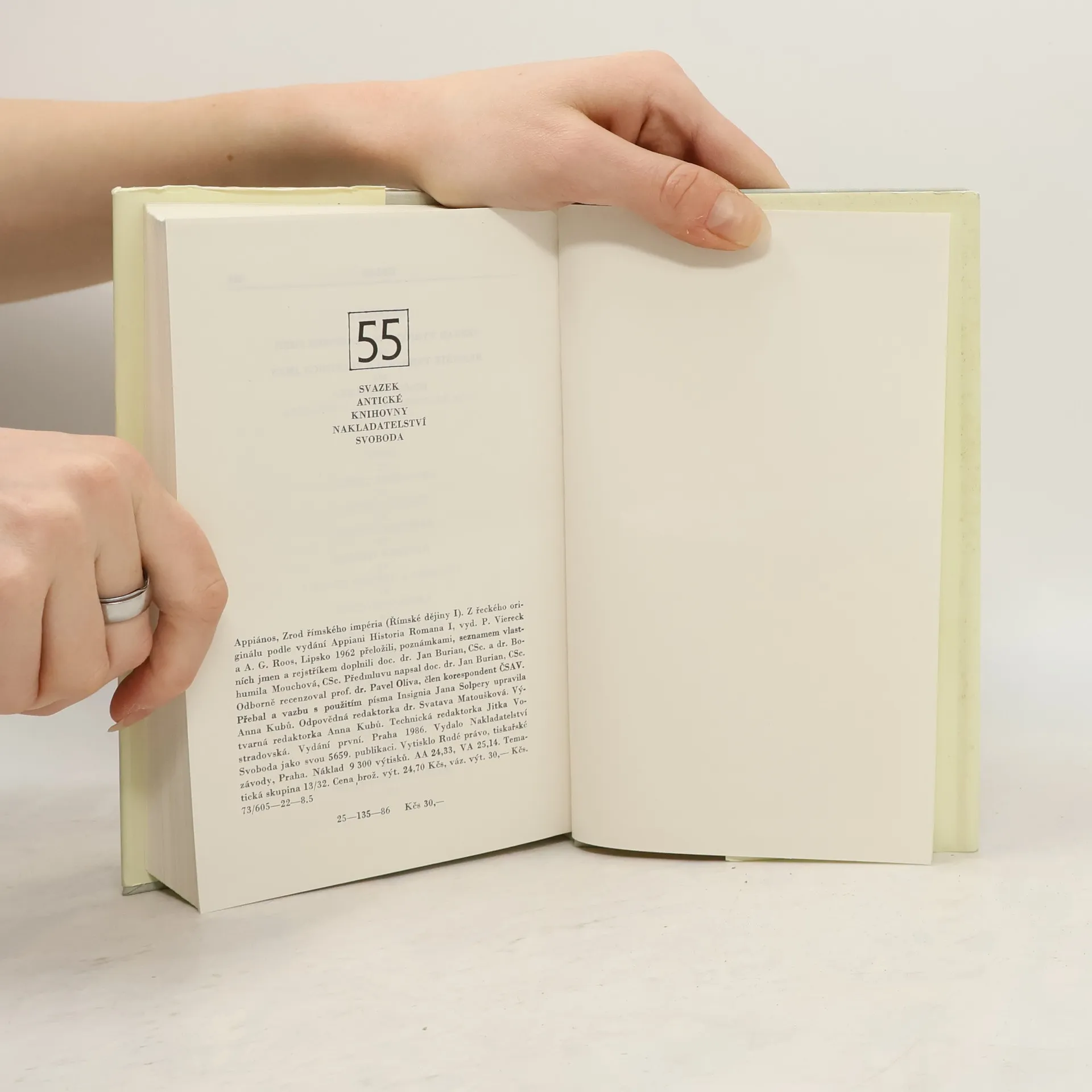 Římské dějiny II - Občanské války. Alexendrijský Řek Appiános, narozený na sklonku 1. století našeho letopočtu, vylíčil nejen vznik římského impéria a jeho rozpínavost, nýbrž i dějiny římských občanských válek. V pěti knihách, které jim věnoval, sleduje dlouhou a téměř nepřetržitou řadu sociálních a politických konfliktů od poslední třetiny 2. století př. n. l. až do roku 35 n.l. Hnutí bratří Gracchů, kteří své reformy zaplatili životem, válka se spojenci, politické vyrovnání mariovců a sullovců, vzpoura otroků vedených Spartakem - to jsou úseky z římských dějin, o ncihž Appiános pojednává podrobně i se zaujetím v první knize. Dále pokračuje scénami z bojů mezi Caesarem a Pompeiem, Caesarovým vítězstvím i jeho vraždou. Ještě větší napětí vkládá do vyprávění o marném zápase Bruta a Cassia za republikánskou svobodu. Nečekané zvraty provázejí stejně nečekaný a energický vstup devatenáctiletého Octaviana, Caesarova adoptivního syna a pozdějšího císaře Augusta, do neklidného politického života po Caesarově smrti... Ve svém díle se Appiános zaměřuje na významné politické osobnosti - v souladu se starověkou koncepcí historie je totiž povaužje za hlavní činitele dějin - a přibližuje čtenáři jejich velikost nebo malost, odhaluje příčiny a souvislosti jejich vítězství i proher, klade závažné otázky a snaží se nalézt a nalézá zajímavé, i když mnohdy velmi subjektivní odpovědi.