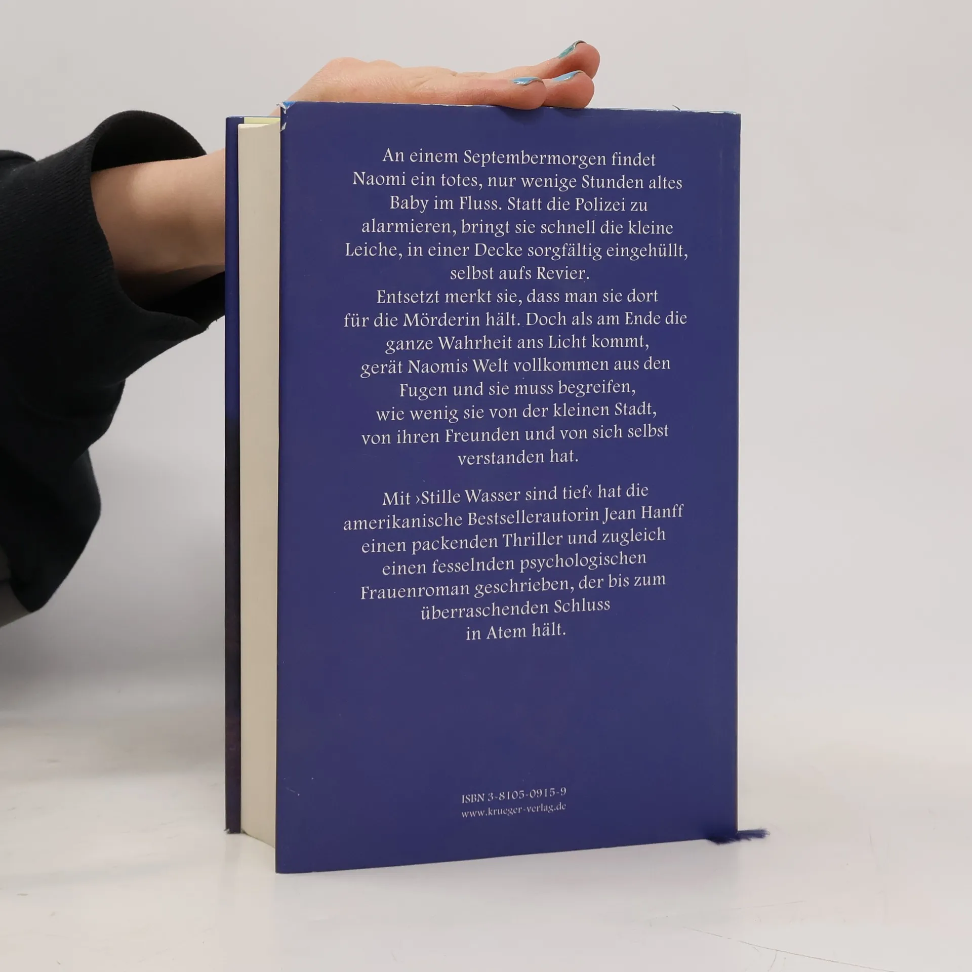Als Naomi an einem Septembermorgen beim Joggen ein totes, nur wenige Stunden altes Baby im Fluss findet, ist sie zutiefst erschüttert. Statt die Polizei zu alarmieren, bringt sie schnell die kleine Leiche, in einer Decke sorgfältig eingehüllt, selbst aufs Revier. Entsetzt merkt sie, dass man sie dort für die Mörderin hält. Nur mit großer Mühe kann sie die Polizei und den Staatsanwalt von ihrer Unschuld überzeugen. Und schon bald verdichtet sich in der kleinen Stadt Goddard ein anderes Gerücht: Man ist sich sicher, dass Heather Pratt, einer jungen, alleinerziehenden Mutter, die auch noch ein Verhältnis mit einem verheirateten Mann hat, alles zuzutrauen ist. Nur Naomi, die selbst eine Außenseiterin in der kleinen Stadt geblieben ist, hält Heather für unschuldig. Und als Heather verzweifelt und allein, unter dem Druck stundenlanger Verhöre, den Mord gesteht, engagiert Naomi ihre Freundin, die Rechtsanwältin Judith Friedman, um Heather zu verteidigen. Doch als am Ende die ganze Wahrheit ans Licht kommt, gerät Naomis Welt vollkommen aus den Fugen und sie muss begreifen, wie wenig sie von der kleinen Stadt, ihren Freunden und letztlich von sich selbst verstanden hat. Mit 'Stille Wasser sind tief' hat die amerikanische Bestsellerautorin Jean Hanff einen packenden Thriller und einen fesselnden psychologischen Frauenroman geschrieben, der bis zum überraschenden Schluss in Atem hält.