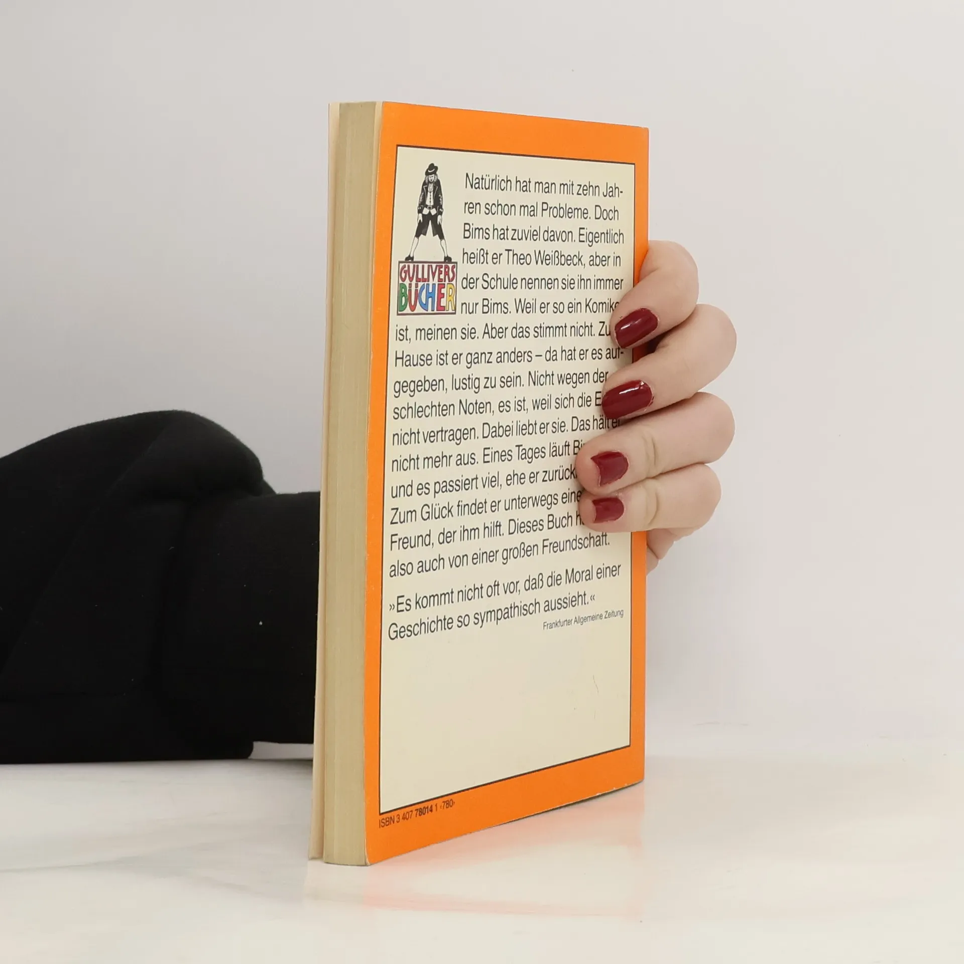 Theo, auch Bims genannt, hat seine Eltern lieb. Trotzdem ist es manchmal schwierig mit ihnen, wenn sie sich streiten oder der Vater getrunken hat. Dann will er einfach nicht mehr zu Hause sein. Eines Tages haut Theo ab! Natürlich hat man mit zehn Jahren schon mal Probleme. Doch Bims hat zuviel davon. Eigentlich heißt er Theo Weißbeck, aber in der Schule nennen sie ihn immer nur Bims. Weil er so ein Komiker ist, meinen sie. Aber das stimmt nicht. Zu Hause ist er ganz anders - da hat er es aufgegeben, lustig zu sein. Nicht wegen der schlechten Noten, sondern weil sich die Eltern nicht vertragen. Dabei liebt er sie. Da läuft Bims weg. Zum Glück findet er unterwegs einen Freund.