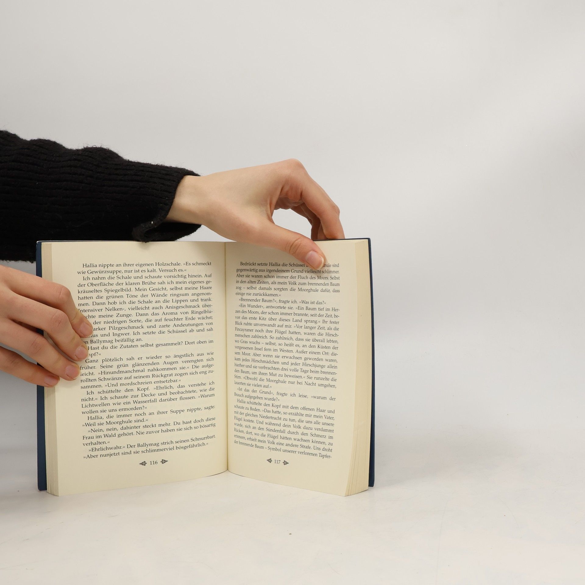 Merlin übt seine Zauberkünste. Ein misslungener Springzauber versetzt ihn und Hallia ins verhexte Moor, wo Merlins Schwert von einem Vogel entführt wird. Bei ihrer Suche treffen sie auf einen jungen Mann, Ector. Merlin droht der tödlichen Verletzung eines Killerkäfers zu erliegen. Heilung kann nur der magische Schlüssel bringen, eines der sieben weisen Werkzeuge Fincayras. Als sie ihn nach zahllosen Abenteuern gefunden haben, erscheint Merlins alte Gegenspielerin Nimue: Schlüssel gegen Schwert, lautet ihr Angebot. Merlin setzt den Schlüssel jedoch ein, um den Zauber zu brechen, den sie über die Moorghule verhängt hat. Das Schwert steckt fest in einem Stein, nur Ector kann es herauszuziehen. Er gesteht, dass er aus einer anderen Zeit stammt, und verspricht, Merlin durch den Zeitspiegel nach Gramarye zu seinem Meister zu bringen, der ihn wird heilen können. Die wallenden Zeitnebel bringen sie zu Ectors Meister, der zu Merlins Verblüffung denselben Namen trägt wie er: Merlin steht sich selbst gegenüber! Und Ectors richtiger Name ist Artus … Ein Festmahl zu dritt krönt das ungewöhnliche Zusammentreffen. Auf dem Weg zurück durch die Zeitnebel wird Merlin klar, dass sein wahres Bild in ihm selbst liegt. Er hat den »Spiegel, der kein Licht braucht« entdeckt. Auch der vierte Teil der Merlin-Saga ist voller Leidenschaft und Tiefgründigkeit und bereichert die Legende um eine faszinierende neue Dimension.