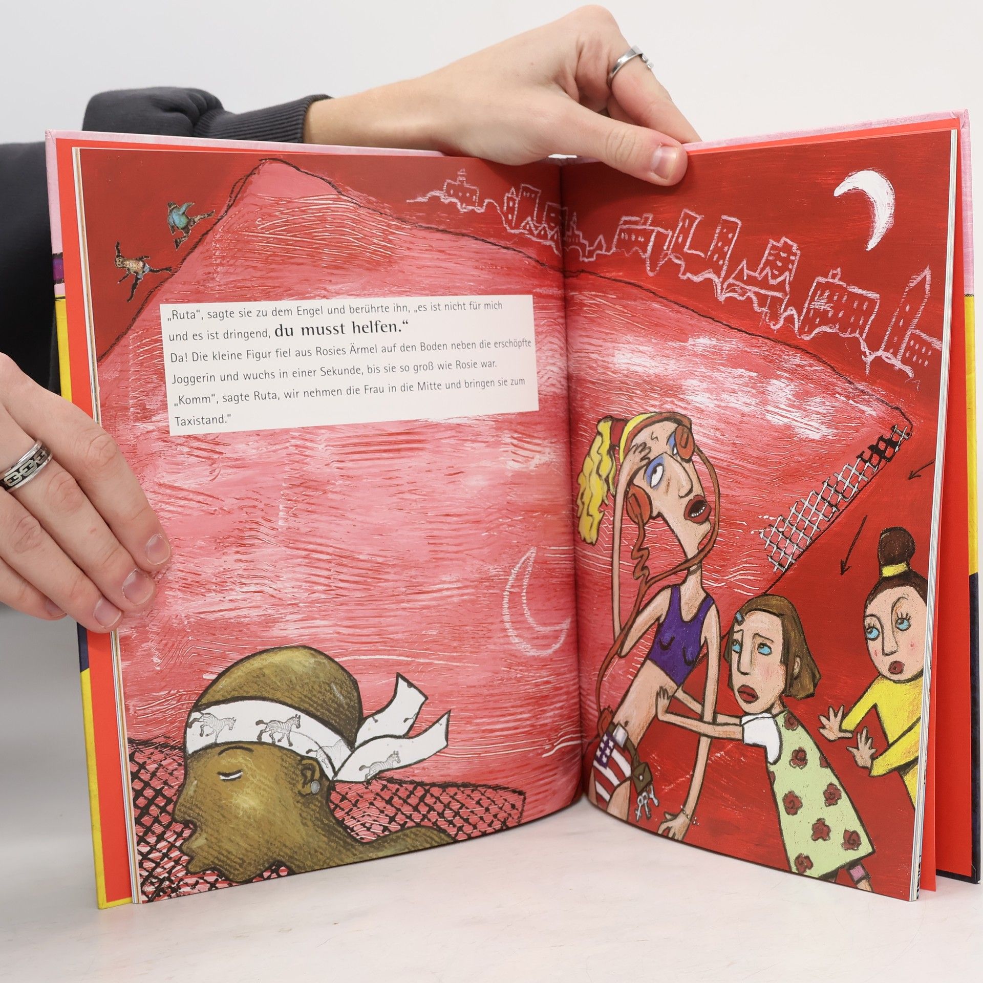 Sieben Erzählungen über das ungewöhnliche Leben eines kleinen Mädchens in den Großstadtschluchten der Metropole New York. Rosie ist ein kleines Mädchen. Sie lebt in New York. Ihre Freunde heißen Loisl und Ruta. Loisl ist ein schwarzer Junge, dessen Mutter Hochzeitstorten bäckt, Ruta ist eigentlich eine winzig kleine Figur, die sich aber, wann immer Rosie sie ruft, in einen Menschen verwandeln kann, um ihr beizustehen. Rosie lebt in dem Stadtteil, der Harlem genannt wird. Da gibt es wundersame Dinge zu erleben: Schlaflieder singende Busdriver, Urwaldkönige mit Silbermänteln, Schlangen tragende Skateboardfahrer und Joggerinnen, die in Kristallpalästen wohnen. Die Kinder entdecken aber nicht nur die realen Welten der Metropole, sie öffnen auch den Zugang zu einer geheimnisvollen und veborgenen Welt im Untergrund der Großstadt, die nur Kinderaugen zu sehen vermögen. Monika Helfer gelingt es, alte Erzählstrukturen in eine glitzernde, atemlose Großstadtluft zu übertragen und in der ihr eigenen, reduzierten Sprache Momentaufnahmen einer Stadt festzuhalten, die sie und ihre Bewohner zum Märchen werden lassen. Birgitta Heiskel arrangiert in ihren kräftigen und farbintensiven Bildcollagen liebevoll Fundstücke und Materialien, die sie in den Straßen New Yorks gesammelt hat. Diese Technik unterstreicht die unwirkliche Atmosphäre des Textes und gibt dem Buch eine ganz individuelle Note.