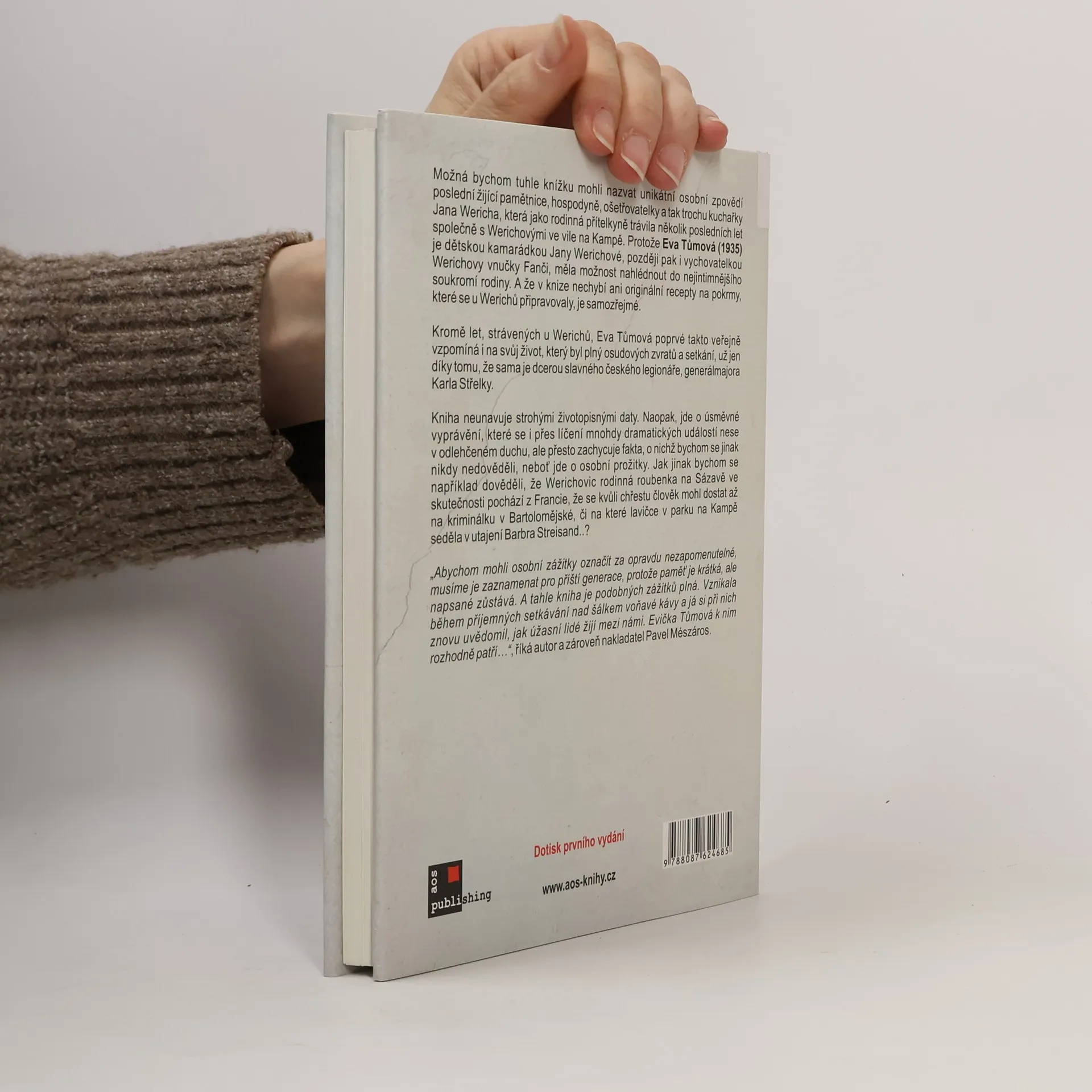 Unikátní osobní zpověď poslední žijící pamětnice, hospodyně, ošetřovatelky a tak trochu kuchařky Jana Wericha, která jako rodinná přítelkyně trávila několik posledních let společně s Werichovými ve vile na Kampě. Protože Eva Tůmová je dětskou kamarádkou Jany Werichové, později pak i vychovatelkou Werichovy vnučky Fanči, měla možnost nahlédnout do nejintimnějšího soukromí rodiny. A že v knize nechybí ani originální recepty na pokrmy, které se u Werichů připravovaly, je samozřejmé. Kromě let, strávených u Werichů, Eva Tůmová poprvé vzpomíná i na svůj život, který byl plný osudových zvratů a setkání, už jen díky tomu, že sama je dcerou slavného čsl. legionáře, generálmajora Karla Střelky. Kniha neunavuje strohými životopisnými daty. Naopak, jde o úsměvné vyprávění, které se i přes líčení mnohdy dramatických událostí nese v odlehčeném duchu, ale přesto zachycuje fakta, o nichž bychom se jinak nikdy nedověděli, neboť jde o osobní prožitky. Jak jinak bychom se například dověděli, že Werichovic rodinná roubenka na Sázavě ve skutečnosti pochází z Francie, že se kvůli chřestu člověk mohl dostat až na kriminálku v Bartolomějské, či na které lavičce v parku na Kampě seděla v utajení Barbra Streisand..? S doslovem Jiřího Wericha Petráška.