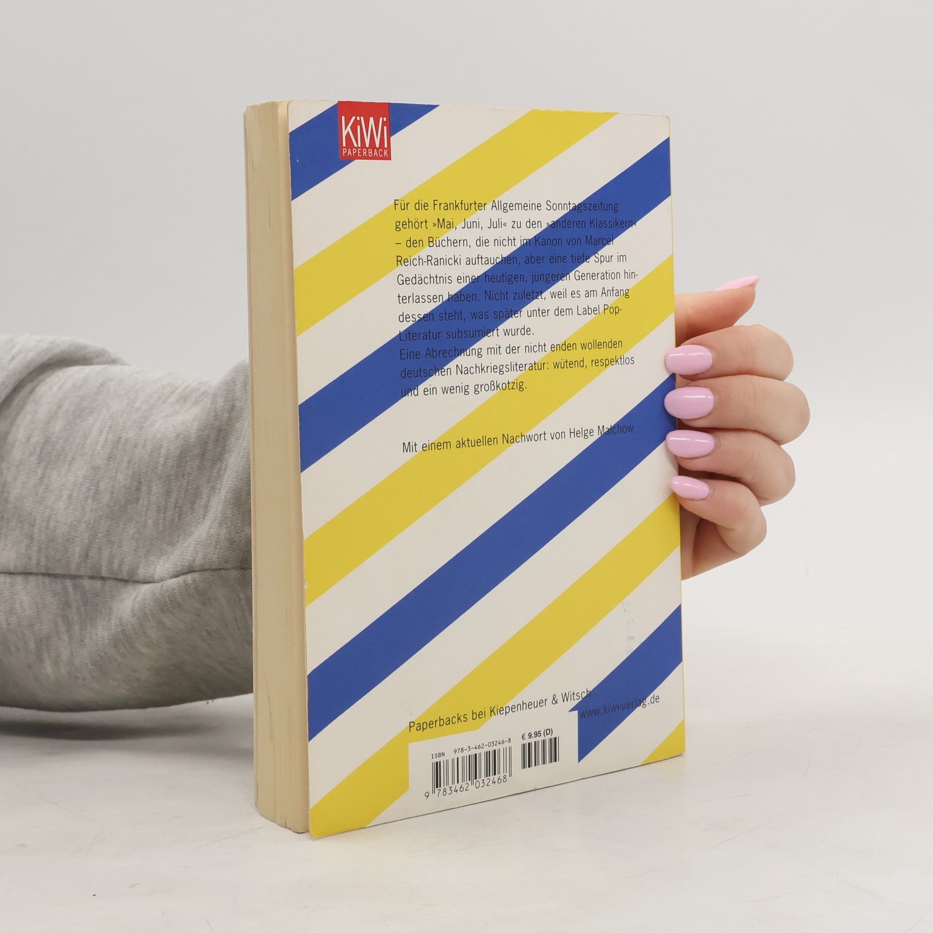 »Das ist kein Buch, das ist das Leben.« Frankfurter Allgemeine Sonntagszeitung Soll er eher etwas Autobiographisches schreiben oder doch lieber einen DDR-Roman? Der namenlose Ich-Erzähler aus Mai, Juni, Juli streift durch eine deutsche Metropole, es ist Mitte der 80er Jahre und alle reden von Pop, Sex und Seele. Er will ein »großer Schriftsteller« werden, aber noch kommt er schlecht aus dem Bett und leidet an Depressionen. Es vergehen Wochen, Monate, und schon wieder ist ein Tag verloren, weil er kein Schreibmaschinenpapier zur Hand hat. Doch immerhin weiß er, was alles nicht vorkommen darf: keine verdammt gute Literatur, keine Monomanie, keine Exzesse, kein Tiefgang, keine geschmäcklerische Yuppie-Schreibe. Für die Frankfurter Allgemeine Sonntagszeitung gehört Mai, Juni, Juli zu den »anderen Klassikern« – den Büchern, die nicht im Kanon von Marcel Reich-Ranicki auftauchen, aber eine tiefe Spur im Gedächtnis einer heutigen, jüngeren Generation hinterlassen haben. Nicht zuletzt, weil es am Anfang dessen steht, was später unter dem Label Pop-Literatur subsumiert wurde, eine Abrechnung mit der nicht enden wollenden deutschen Nachkriegsliteratur: wütend, respektlos und ein wenig großkotzig.