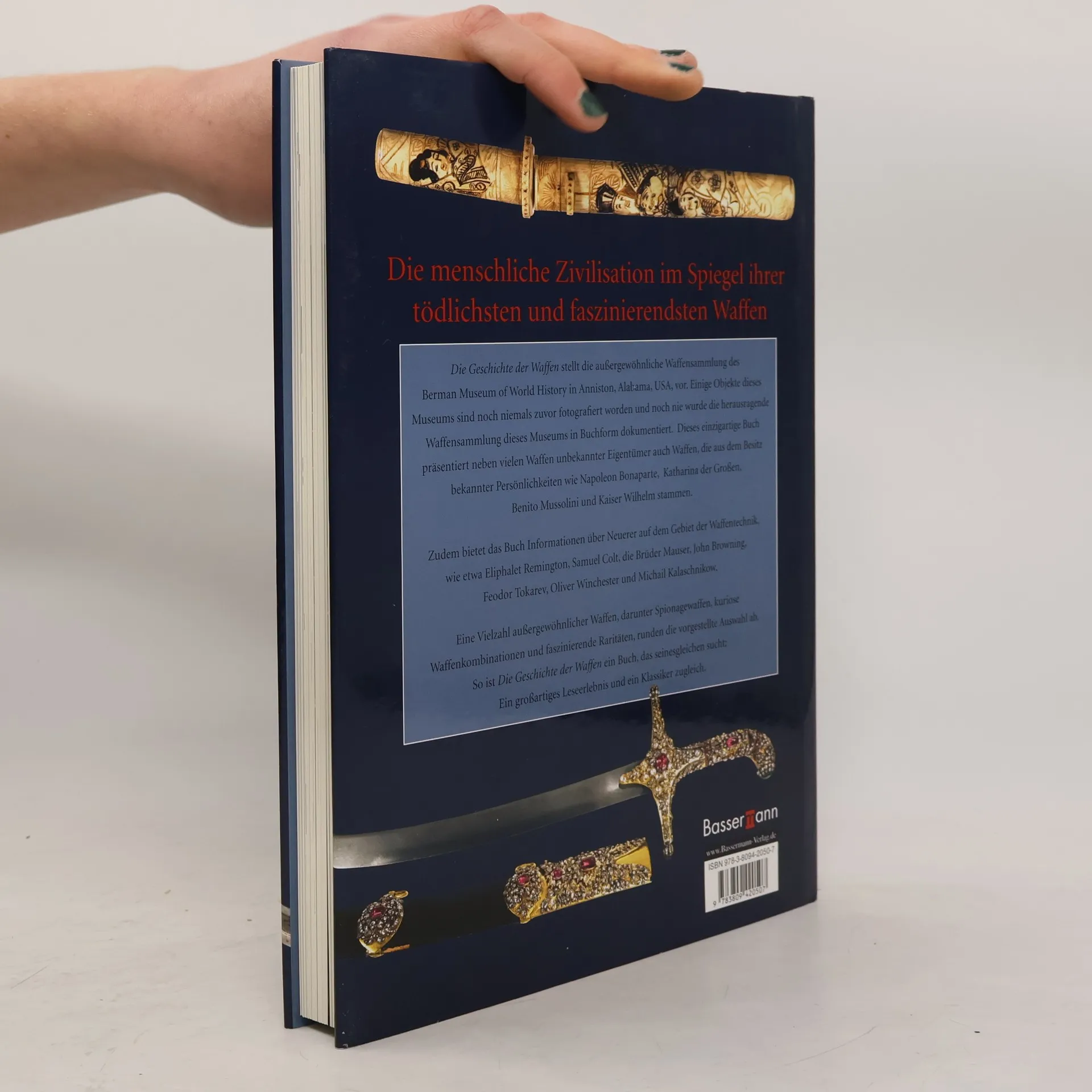 Die Geschichte der Waffen stellt die außergewöhnliche Waffensammlung des Berman Museum of World History in Anniston, Alabama, USA, vor. Einige Objekte dieses Museums sind noch niemals zuvor fotografiert worden und noch nie wurde die herausragende Waffensammlung dieses Museums in Buchform dokumentiert. Dieses einzigartige Buch präsentiert neben vielen Waffen unbekannter Eigentümer auch Waffen, die aus dem Besitz bekannter Persönlichkeiten wie Napoleon Bonaparte, Katharina der Großen, Benito Mussolini und Kaiser Wilhelm stammen. Eine Vielzahl außergewöhnlicher Waffen, darunter Spionagewaffen und kuriose Waffenkombinationen, runden die vorgestellte Auswahl ab.