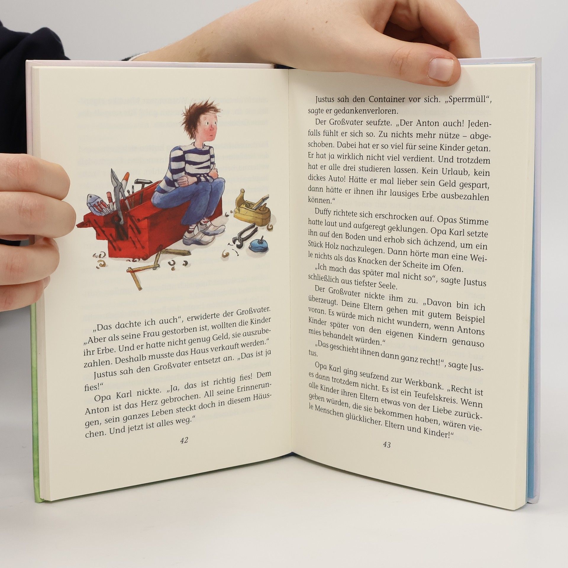 Justus muss für die Schule die 10 Gebote auswendig lernen. Doch wozu soll das bloß gut sein? Sein Opa, mit dem Justus jeden Nachmittag an einem Modellflieger bastelt, erklärt ihm, dass die 10 Gebote eine Art Anleitung für ein glückliches Leben sind. Durch die gemeinsamen Nachmittage in Opas Werkstatt haben die beiden viel Zeit für ausgiebige Gespräche. Der Großvater wird so zum wichtigen Tröster, Schlichter, Aufklärer, Berater und guten Zuhörer für Justus’ Alltagssorgen. Als der fertige Flieger schließlich hoch in die Luft steigt, hat Justus verstanden, dass die 10 Gebote auch in seinem Alltag eine Rolle spielen.