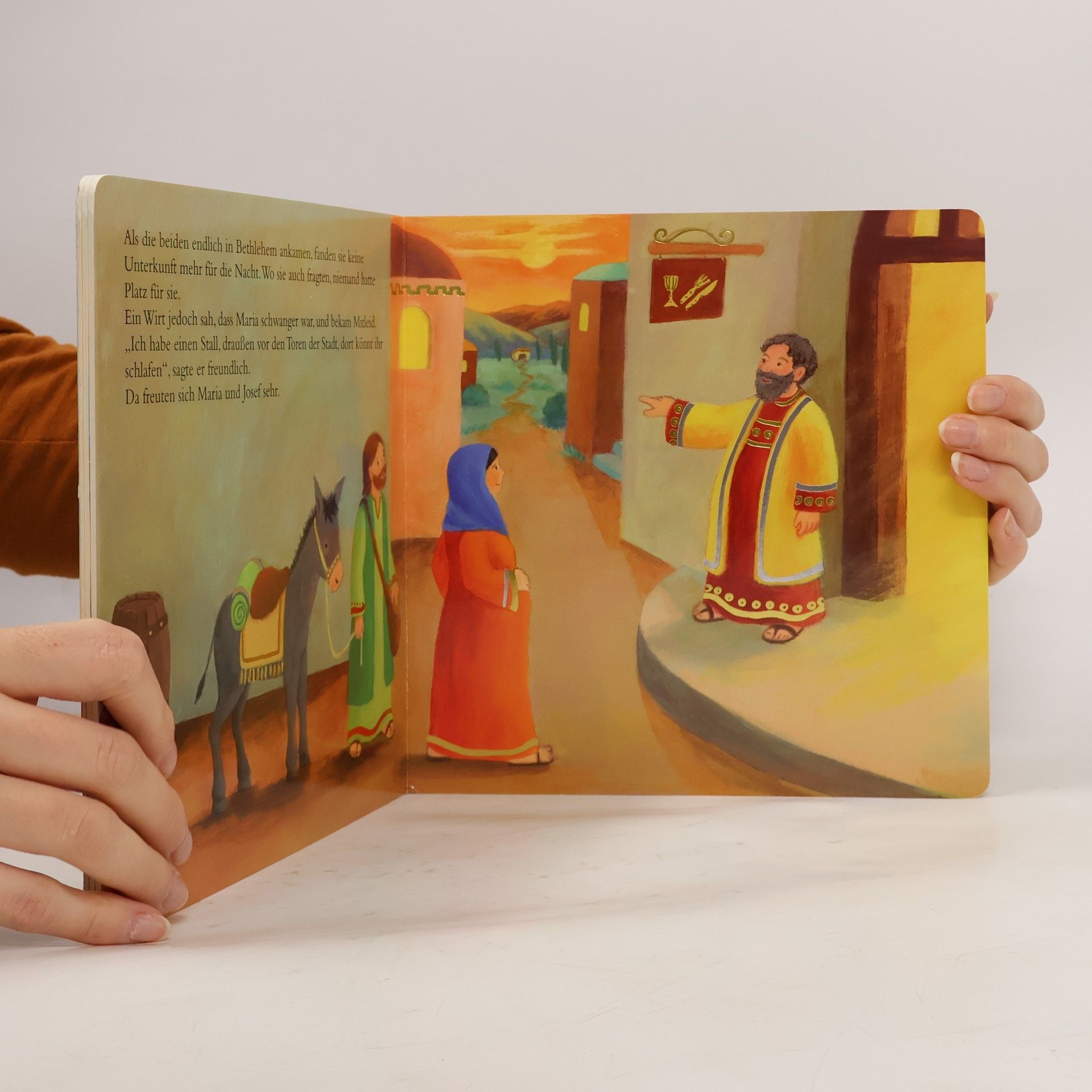 Eines Tages wollte Kaiser Augustus wissen, wie viele Menschen in seinem Reich leben. Er befahl, dass jeder in seine Heimatstadt gehen und sich dort in Steuerlisten eintragen solle. Auch Josef aus Nazareth und seine Frau Maria machten sich auf den Weg. Josef kam aus Bethlehem und die Reise dorthin war sehr anstrengend, denn Maria war schwanger. Bald schon sollte ihr Baby geboren werden. Mit ihren einfühlsamen Bildern erzählt Astrid Krömer nach Lukas und Matthäus vom Weihnachtswunder, das sich vor langer Zeit in Bethlehem zugetragen hat: der Geburt des Jesuskindes. Ein stimmungsvolles, leicht verständliches Buch schon für die Kleinsten.