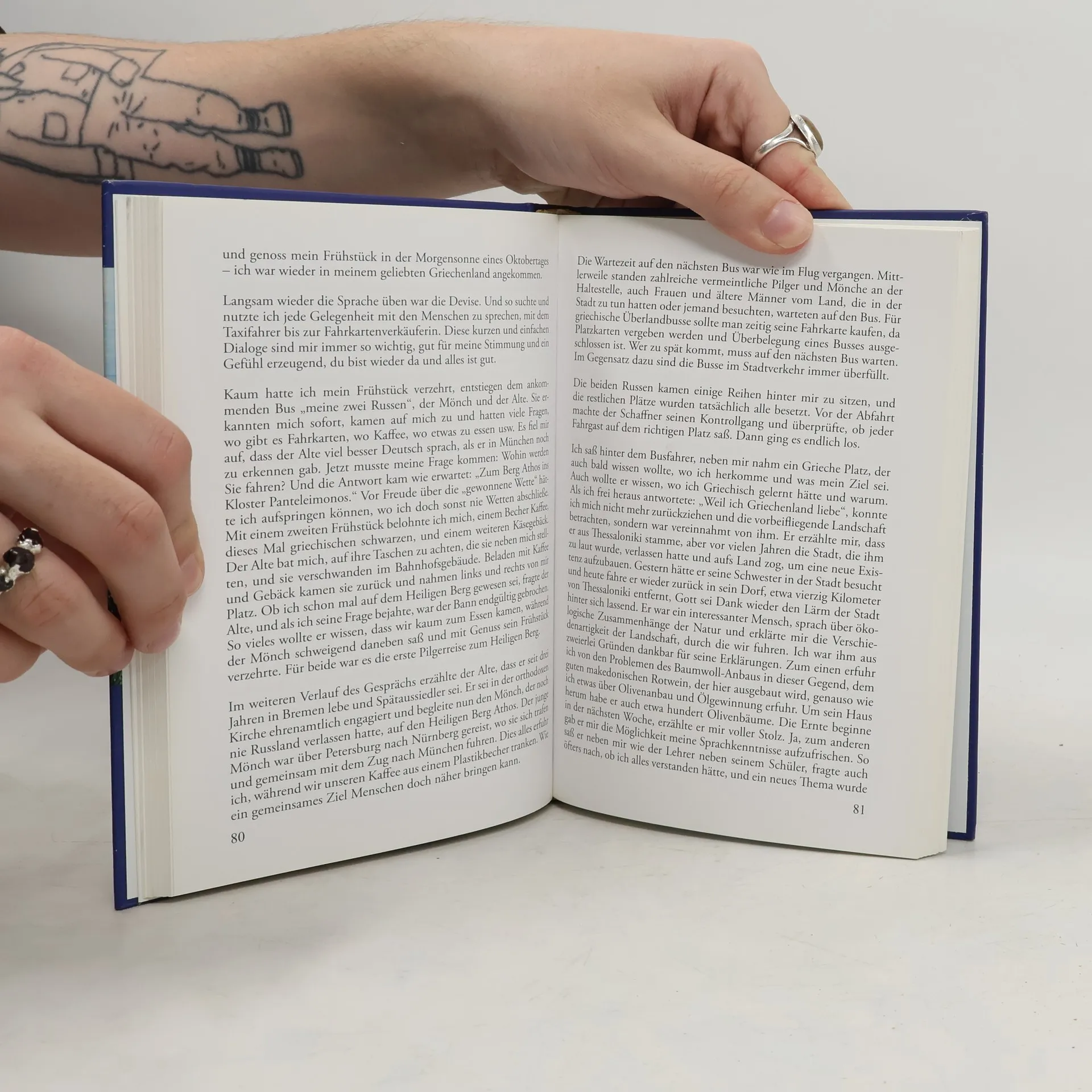 Seine Erkenntnisse hat Haffner in zahlreichen Gesprächen mit Mönchen und anderen Pilgern gewonnen, ferner durch die Teilnahme an Stunden währenden Gottesdiensten, durch das Erleben der absoluten Stille in langen Nächten im Kloster oder unter freiem Himmel. Dennoch hebt der Autor nicht ab, verliert sich nicht in kritikloser Schwärmerei, sondern befasst sich in seiner Erzählung auch immer wieder mit dem Alltag der kleinen Leute, beschreibt die Freundlichkeit und Hilfsbereitschaft, die man ihm, dem Athospilger, entgegenbrachte. Helmut A. Haffner versteht es zu schreiben wie einer, der nach langer Reise im Kreis seiner Freunde und Bekannten spannend erzählt. Man hört ihm gerne zu. Seine Erzählungen werden nie langweilig, weil er den Leser nicht mit trockenen Daten und Fakten überhäuft. Dennoch wird man am Ende einiges mehr über Griechenland im Allgemeinen und über die Orthodoxie im Besonderen, über ihr Mönchtum, ihre Spiritualität und ihre religiöse Praxis wissen. Ein ausführliches Glossar am Ende des Buches erweist sich dabei als sehr nützlich. Die zahlreichen Fotos stammen vom Autor selbst und sollen helfen, sich das Gelesene besser vorstellen zu können.