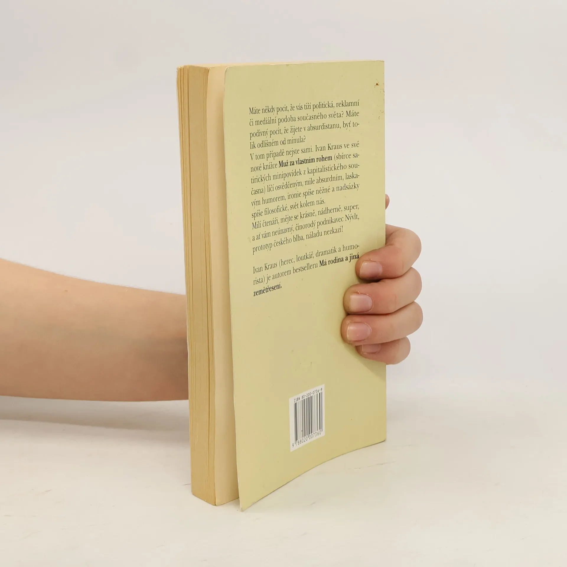 Máte někdy pocit, že vás tíží politická, reklamní či mediální podoba současného světa? Máte podivný pocit, že žijete v Absurdistánu, byť tolik odlišném od minula? V tom případě nejste sami. Sbírka satirických minipovídek z kapitalistického současna Muž za vlastním rohem líčíosvědčeným, mile laskavým humorem svět kolem nás. Milí čtenáři, mějte se krásně, nádherně, super, a ať vám neúnavný, činorodý podnikavec Nývlt, prototyp českého člověka, nezkazí náladu! Dotisky v roce 2000, 2002, 2003 a 2010.