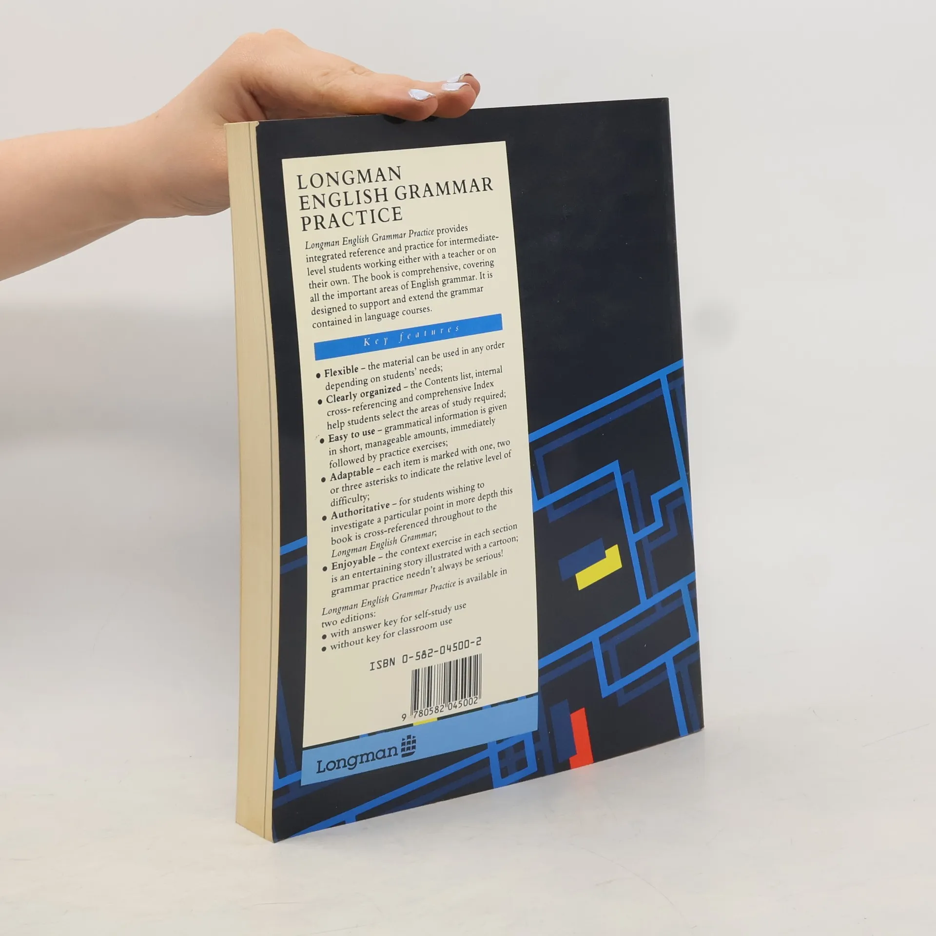 * Flexible -- the material can be used in any order, depending on students' needs. * Clearly organised -- the Contents list, internal cross-referencing and comprehensive Index helps students select the areas of study required. * Easy to use -- grammatical information is given in short, manageable amounts, immediately followed by practice exercises. * Adaptable -- each item is marked with one, two or three asterisks to indicate the relative level of difficulty. * Authoritative -- for students wishing to investigate as particular point in more depth this book is cross-referenced throughout to the Longman English Grammar. * Enjoyable -- the context exercise in each section is an entertaining story illustrated with a cartoon; grammar practice needn't always be serious!