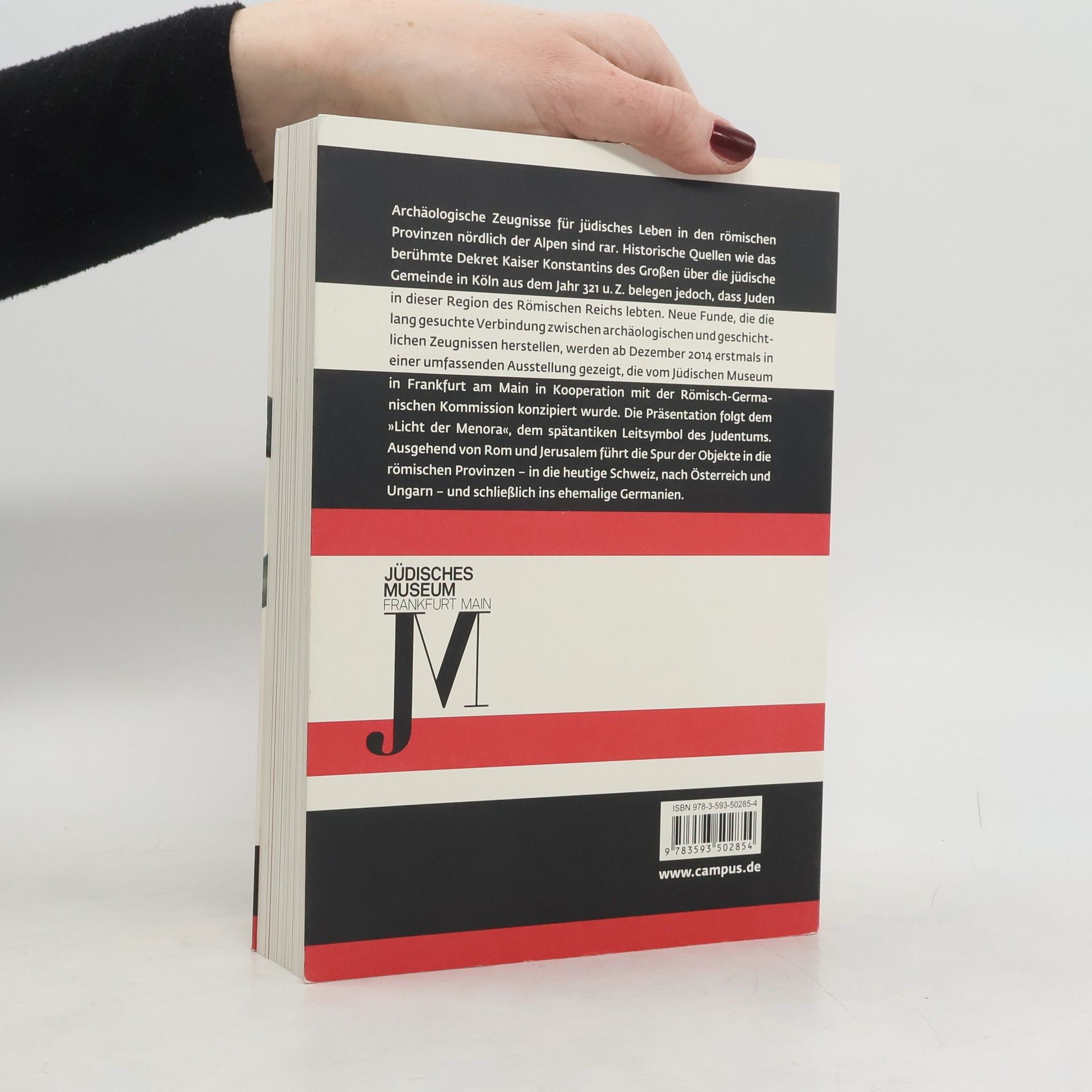 Archäologische Zeugnisse für jüdisches Leben in den römischen Provinzen nördlich der Alpen sind rar. Historische Quellen wie das berühmte Dekret Kaiser Konstantins des Großen über die jüdische Gemeinde in Köln aus dem Jahr 321 n. Chr. belegen jedoch, dass Juden in dieser Region des Römischen Reiches lebten. Neue Funde, die die lang gesuchte Verbindung zwischen archäologischen und geschichtlichen Zeugnissen herstellen, werden ab Dezember 2014 erstmals in einer umfassenden Ausstellung gezeigt, die vom Jüdischen Museum in Frankfurt am Main in Kooperation mit der Römisch-Germanischen Kommission konzipiert wurde. Die Präsentation folgt dem »Licht der Menora«, dem spätantiken Leitsymbol des Judentums. Ausgehend von Rom und Jerusalem, führt die Spur der Objekte in die römischen Provinzen – in die heutige Schweiz, nach Österreich und Ungarn – und schließlich ins ehemalige Germanien.