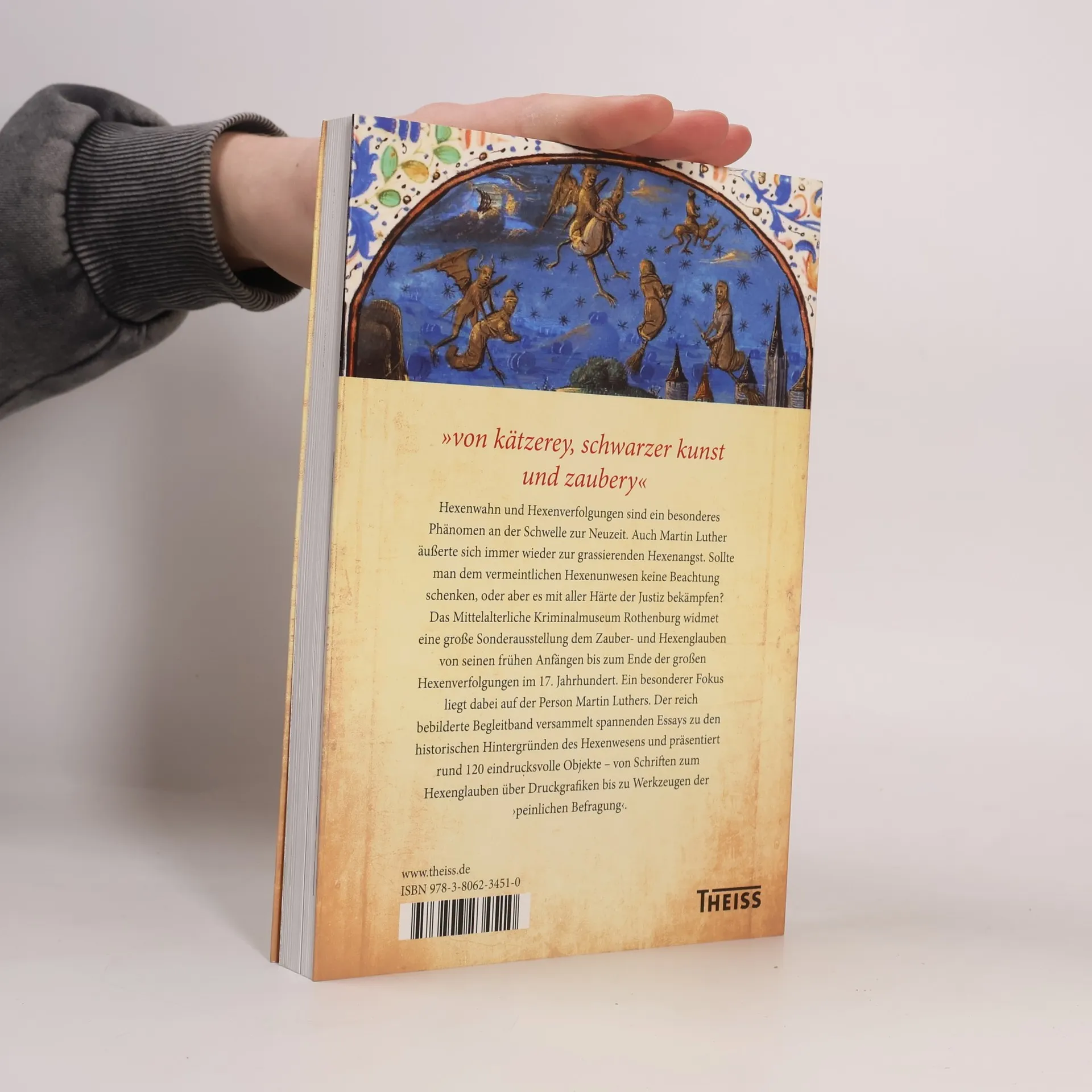 Hexenwahn und Hexenverfolgungen sind ein besonderes Phänomen an der Schwelle zur Neuzeit. Martin Luther, als eines der prominentesten Kinder seiner Zeit, äußerte sich immer wieder zur grassierenden Hexenangst. Sollte man dem vermeintlichen Hexenunwesen keine Beachtung schenken oder aber es mit aller Härte der Justiz bekämpfen? In einer großen Sonderausstellung widmet sich das Mittelalterliche Kriminalmuseum dem Hexenglauben – von den frühen Anfängen im späten Mittelalter bis zum Ende der großen Hexenverfolgungen im 17. Jhr. Ein besonderer Fokus liegt dabei auf der Rolle Martin Luthers und seinen Stellungnahmen für und wider den Hexenglauben. Überdies beleuchtet die Ausstellung, die bis Ende 2018 läuft, auch die Reformation und die Hexenverfolgungen in Franken und Rothenburg ob der Tauber. Der reich bebilderte Begleitband präsentiert neben spannenden historischen Hintergründen rund 100 eindrucksvolle Objekte – von Schriften zum Hexenglauben bis zu Werkzeugen der ›peinlichen Befragung‹.