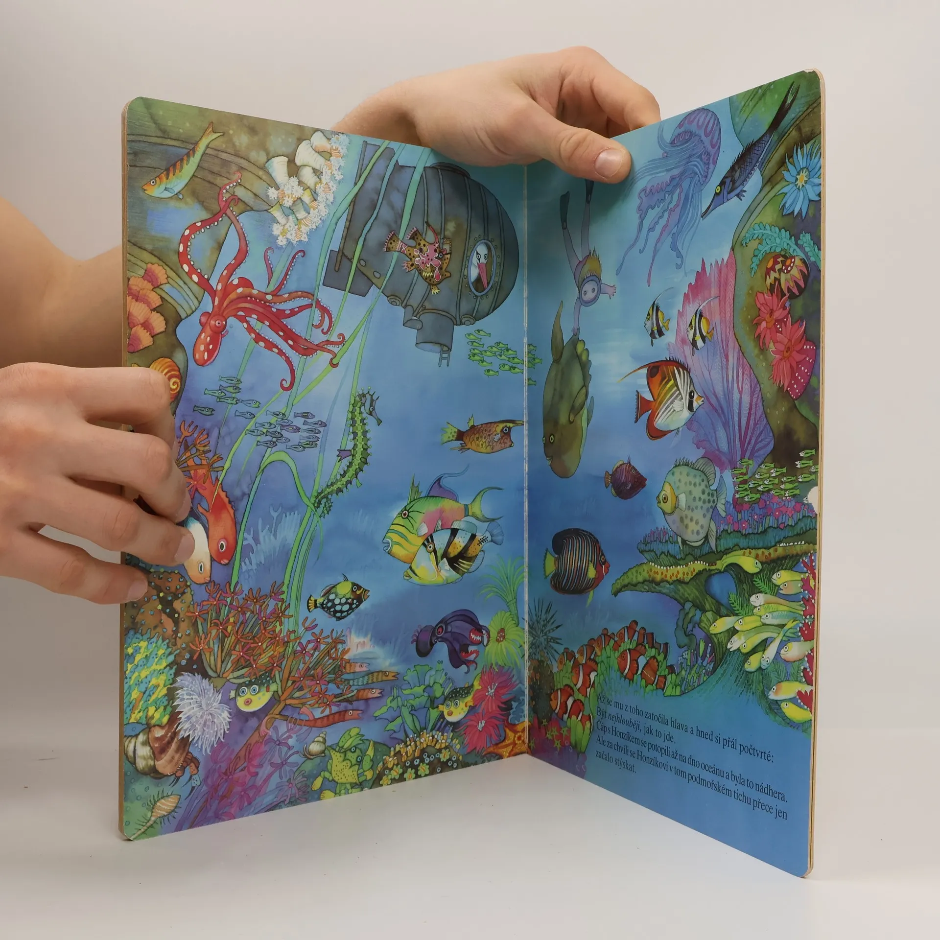 Velké obrázkové dvoustrany s minimem textu vyprávějí o 5 různých prostředích, kam se s pomocí čápa dostává malý Honzík.