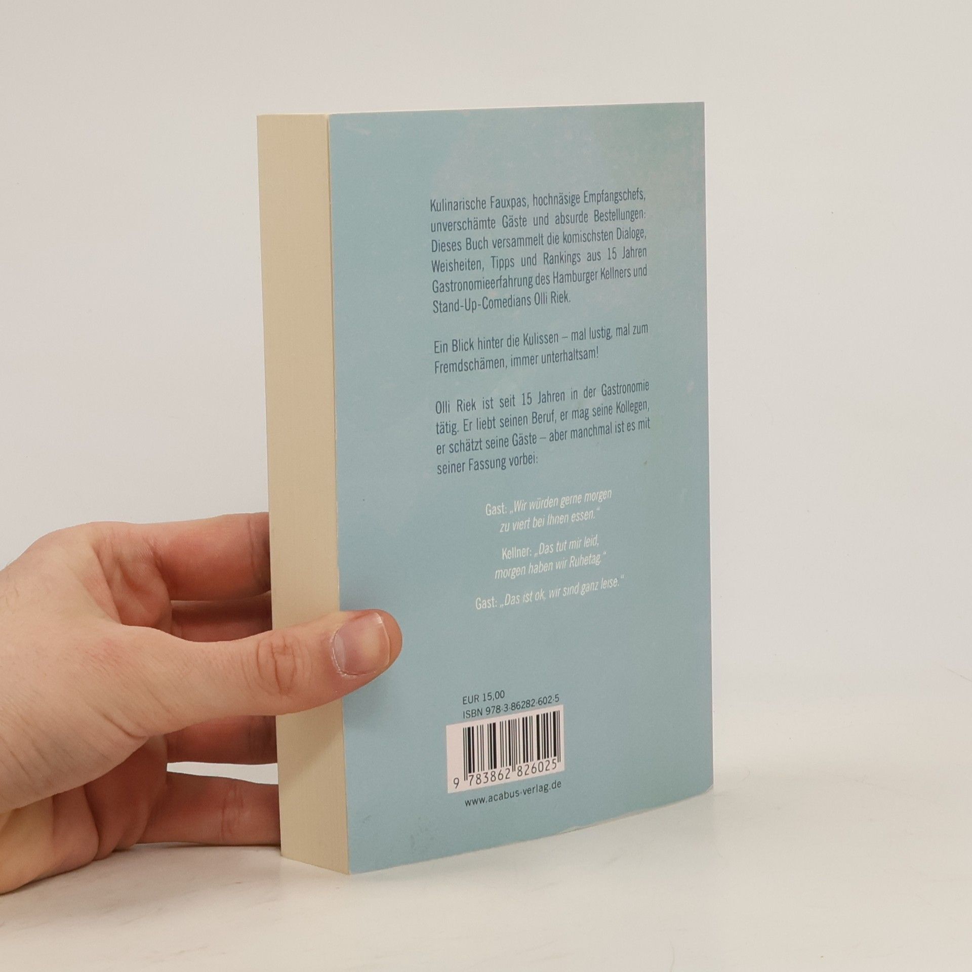 Kulinarische Fauxpas, hochnäsige Empfangschefs, unverschämte Gäste und absurde Bestellungen: Dieses Buch versammelt die komischsten Dialoge, Weisheiten, Tipps und Rankings aus 15 Jahren Gastronomieerfahrung des Hamburger Kellners und Stand-Up-Comedians Olli Riek. Ein Blick hinter die Kulissen – Mal lustig, mal zum Fremdschämen, immer unterhaltsam! Olli Riek ist seit 15 Jahren in der Gastronomie tätig. Er liebt seinen Beruf, er mag seine Kollegen, er schätzt seine Gäste – aber manchmal ist es mit seiner Fassung vorbei: Gast: „Wir würden gerne morgen zu viert bei Ihnen essen.“ Kellner: „Das tut mir leid, morgen haben wir Ruhetag.“ Gast: „Das ist ok, wir sind ganz leise.“